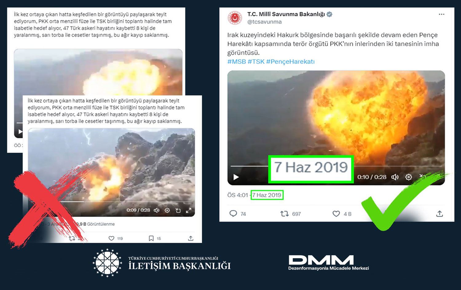 “Bazı sosyal medya hesaplarından paylaşılan görüntülerle ilgili, ‘PKK orta menzilli füze ile TSK birliğini vurdu 47 Türk askeri hayatını kaybetti 8 kişi de yaralandı’ iddiası doğru değildir.