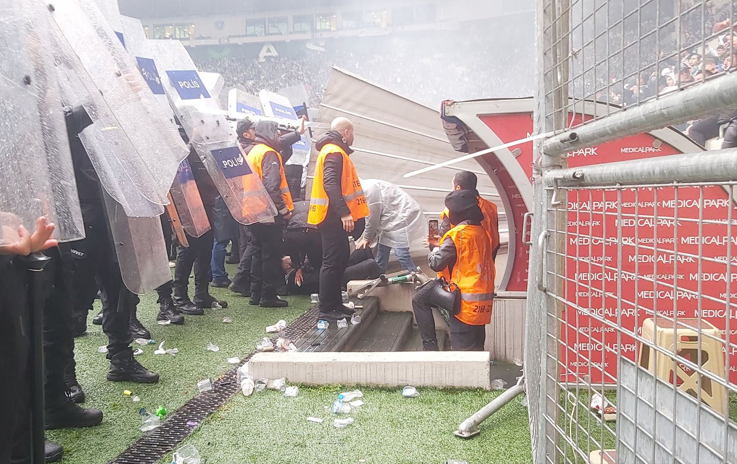 Maç öncesi başlayan olaylar ilk düdüğün çalmasıyla birlikte saha içine de yansıdı. Bursaspor tribünlerinden sahaya maç boyu yabancı madde atılırken, bir süre sonra zemin neredeyse görünmeyecek hale geldi.