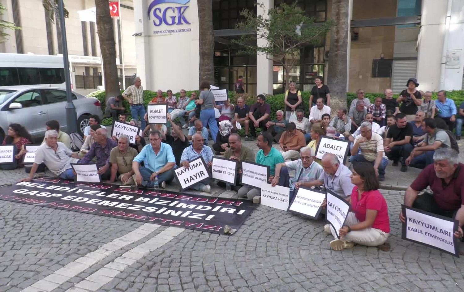 Haber Merkezi - DEM Partili Hakkari Belediye Eş Başkanı Mehmet Sıddık Akış'ın İçişleri Bakanlığı tarafından görevinden uzaklaştırılarak yerine kayyım atanması İzmir’de protesto edildi. Konak’ta SGK İzmir İl Müdürlüğü’nün önünde toplanan DEM Parti, EMEK Partisi, TÖP, TİP ve EHP üyeleri “Kayyım darbedir! Belediyeler bizimdir! Gasp edemezsiniz! Kayyıma karşı nöbetteyiz” pankartı açarak oturma eylemi yaptı.