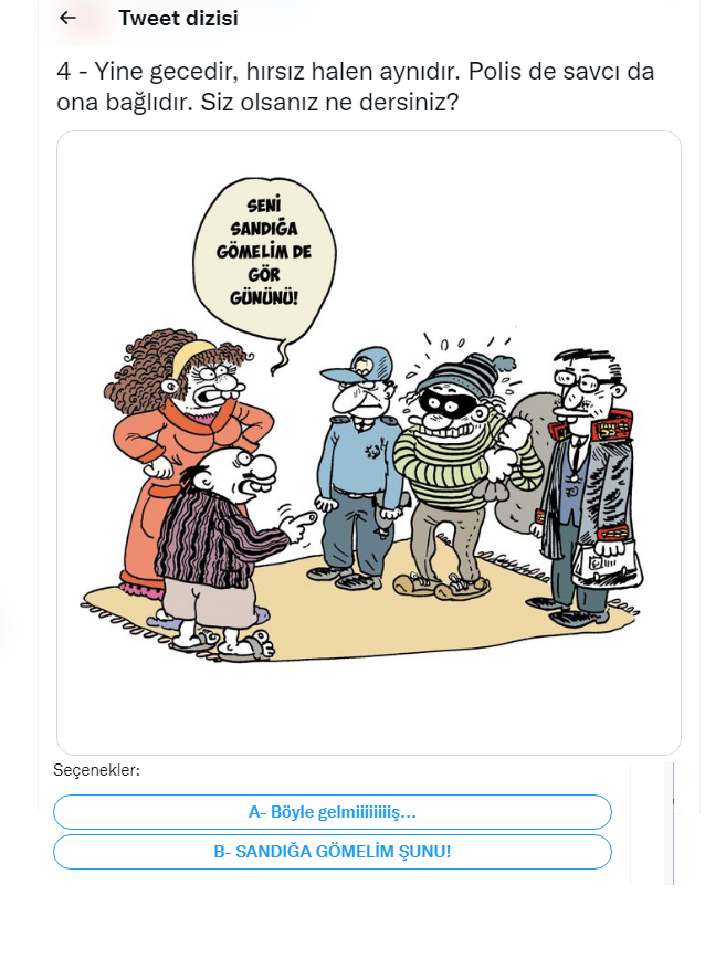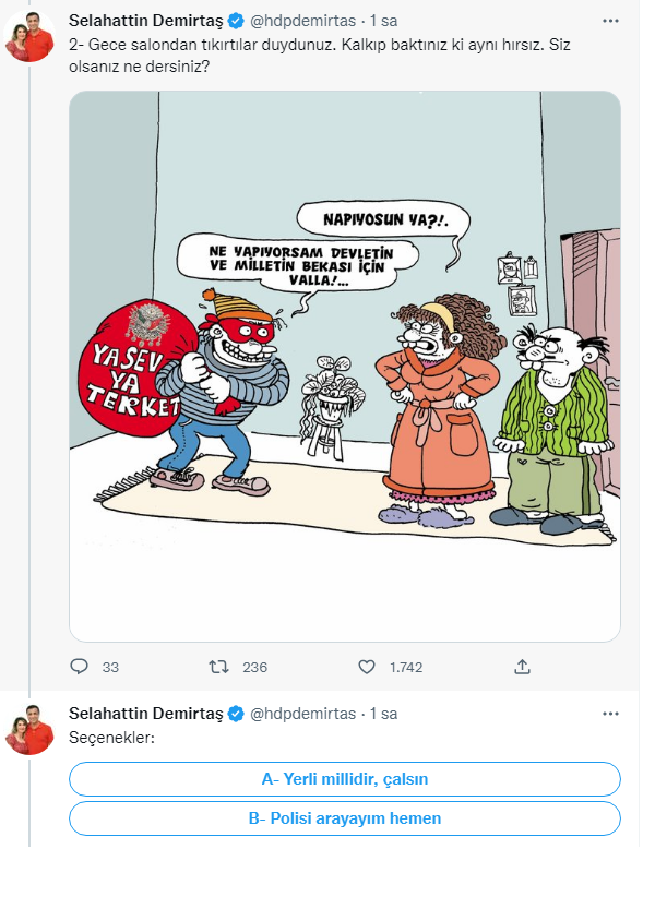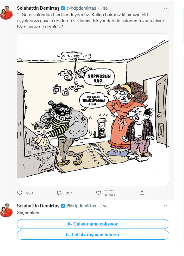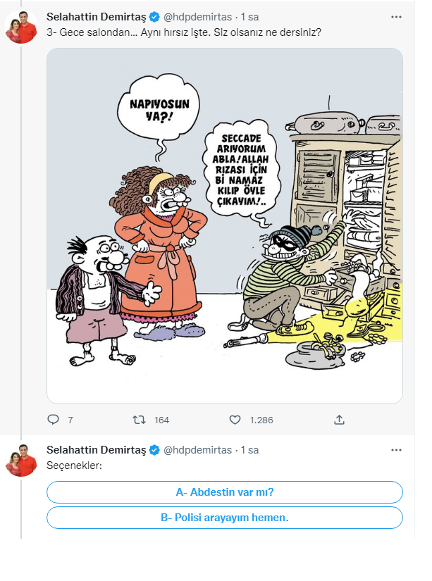 Demirtaş daha sonra dediği gibi saat 18:00’da 4 karikatür ve seçenekli sorulardan oluşan anketini paylaştı. Demirtaş'ın paylaşımı şu şekilde: