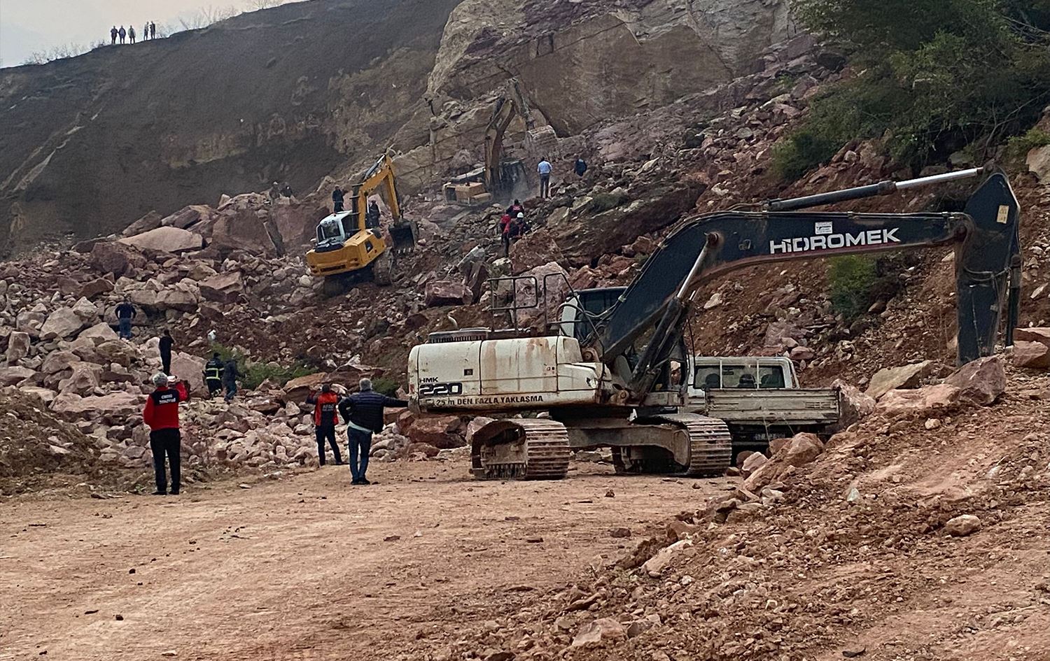 "Taş ocağında saat 12.00 sularında rutin işler kapsamında yapılan bir patlatma var. Ancak 16.30 sularında üst kotlardan bir kütle hareketi söz konusu. Şu anda kütlenin altında bir kamyon ve bir iş makinesi, sürücüsü ile operatörü bulunuyor. Şu anda burayı bilen arkadaşlarımızın tarif ettiği noktada çalışan iş makineleri var. Bu çalışmalara destek veren 20'ye yakın iş makinemiz var. AFAD, UMKE, jandarma ve 112 ekipleri burada."