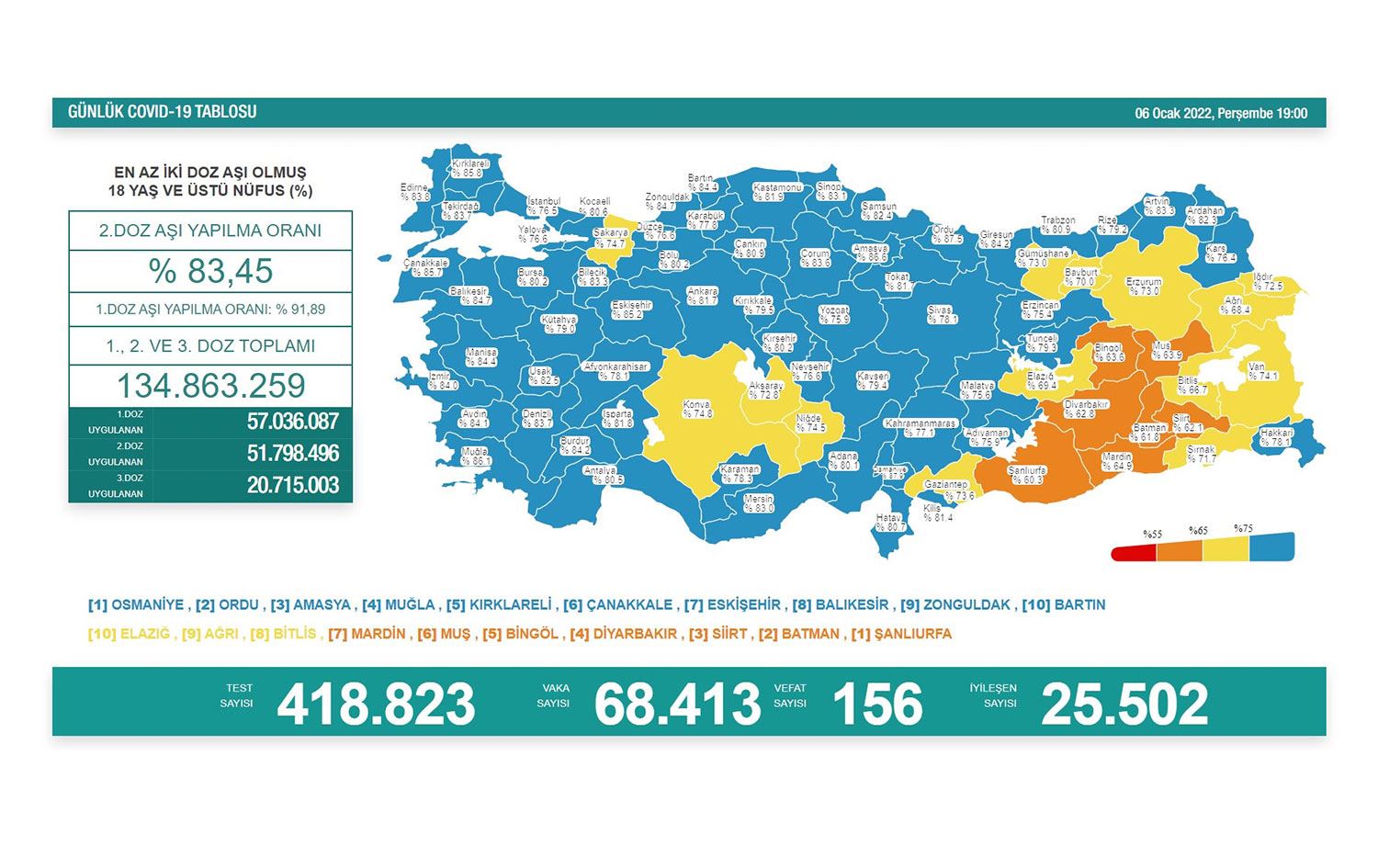 Haber Merkezi – Türkiye'de son 24 saatte 418 bin 823 Kovid-19 testi yapıldı, 68 bin 413 kişinin testi pozitif çıktı, 156 kişi yaşamını yitirdi.