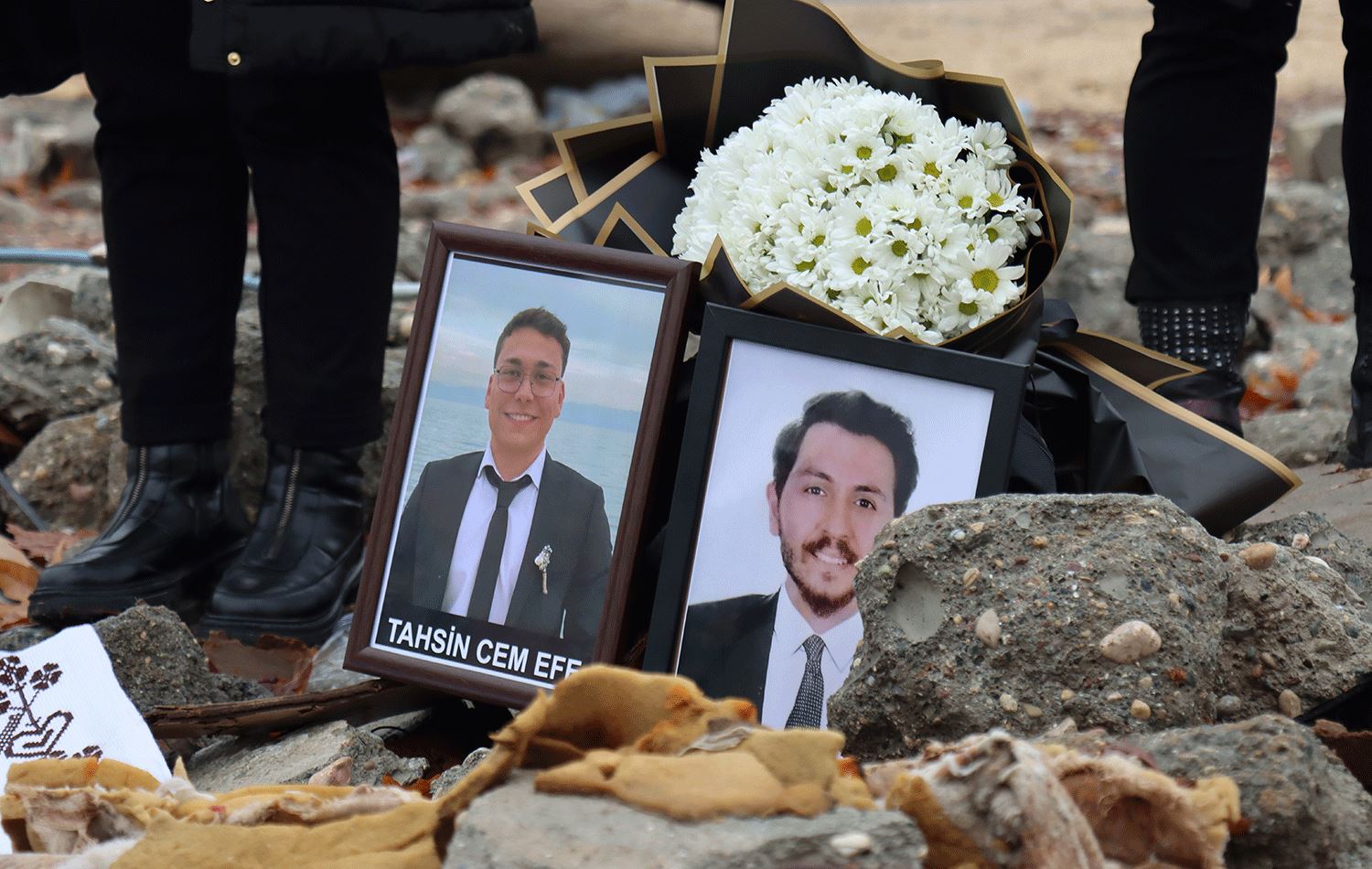 Depremlerde Adıyaman'da yıkılan otelde çocuklarını kaybeden aileler, otelin enkazına çiçek bıraktı. / AA