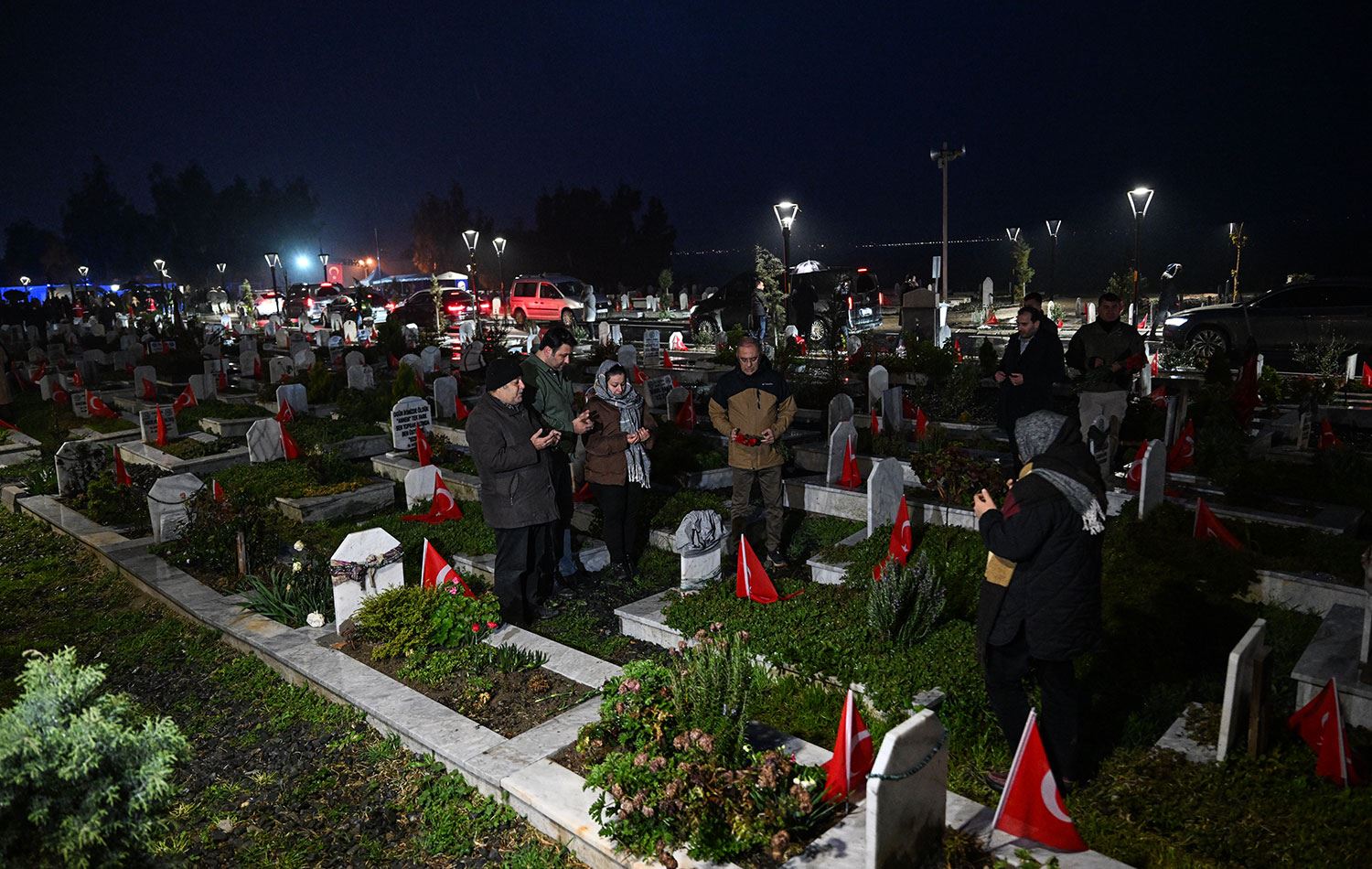Maraş merkezli depremlerden etkilenen Hatay'ın merkez Antakya ilçesindeki Narlıca Deprem Şehitleri Mezarlığı'nda yakınlarının kabrini ziyaret eden aileler, mezar başında dua etti. / AA