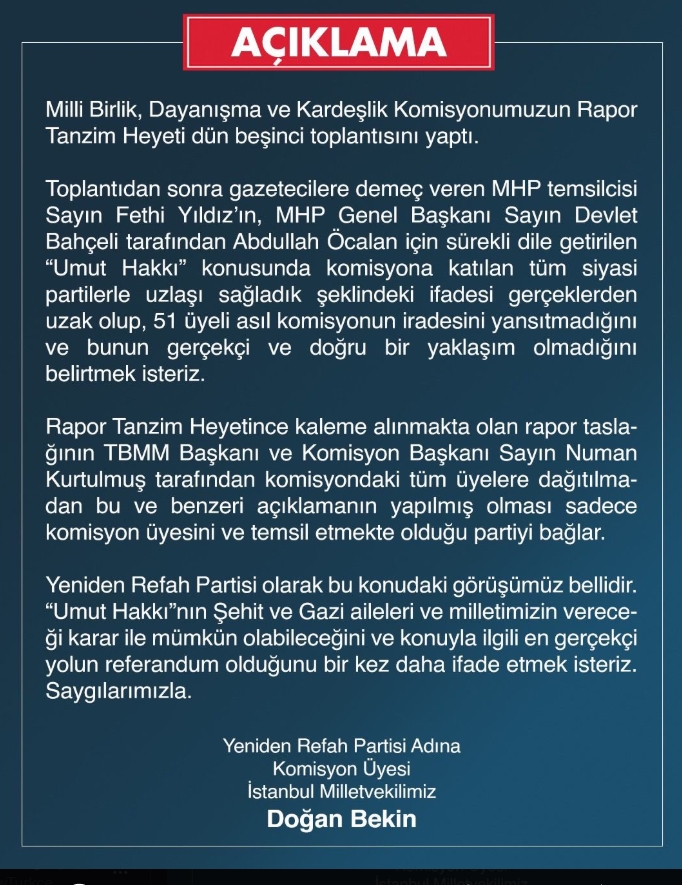 Yeniden Refah Partisi adına TBMM Millî Birlik, Dayanışma ve Kardeşlik Komisyonu üyesi Doğan Bekin, Abdullah Öcalan için gündeme getirilen "umut hakkı" konusunda tüm partilerle uzlaşı sağlandığı yönündeki açıklamaların gerçeği yansıtmadığını belirtti.