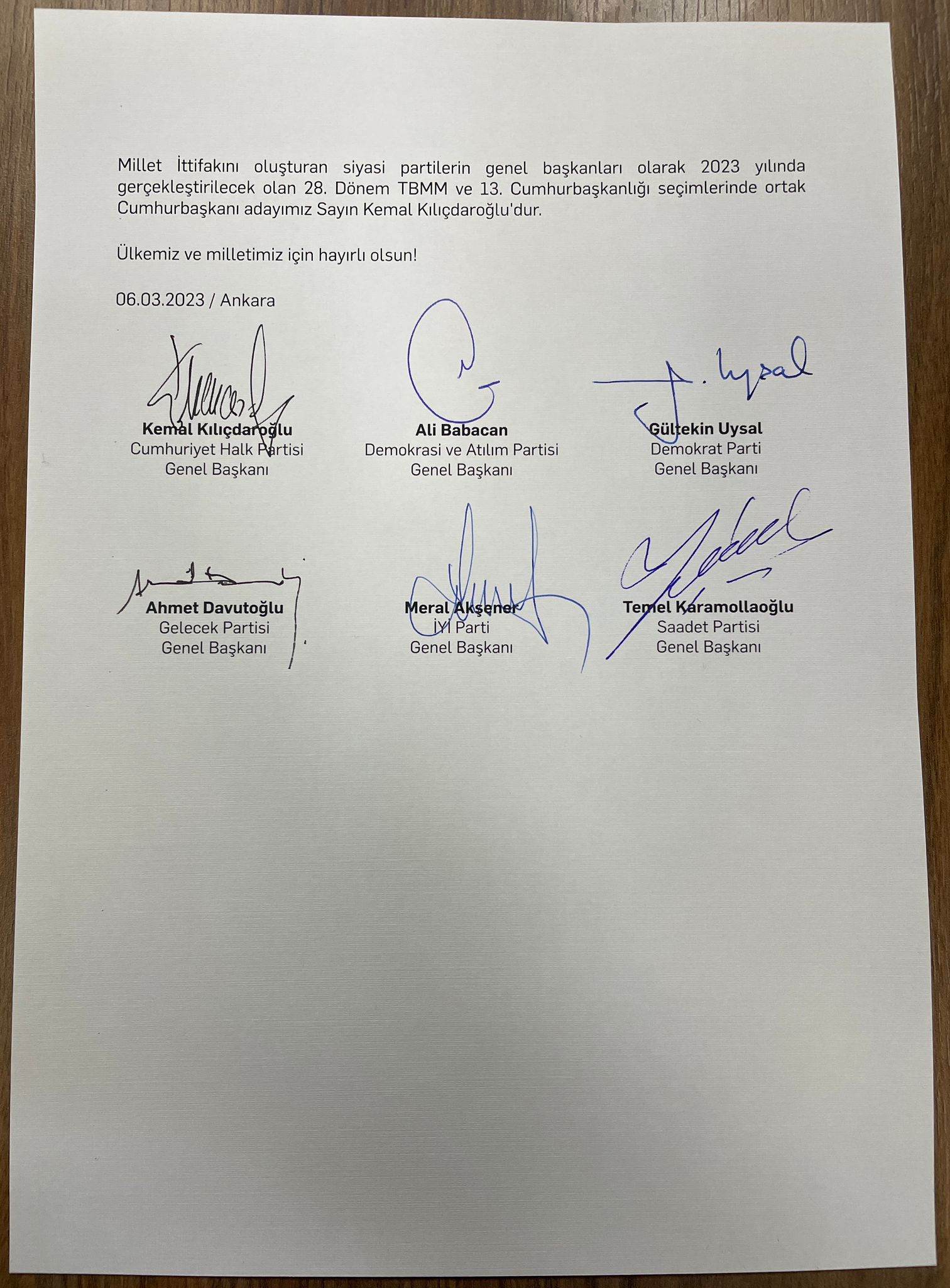 Saatlerece süren toplantının ardından CHP Genel Başkanı Kemal Kılıçdaroğlu'nun adı Millet İttifakı’nın cumhurbaşkanı adayı olarak kamuoyuna resmen ilan edildi.