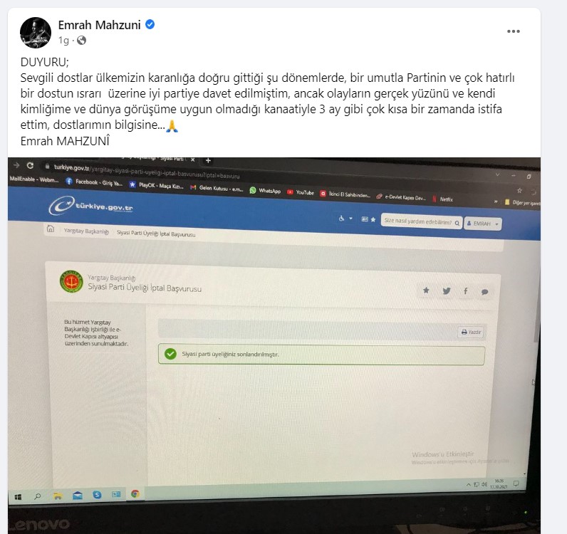 Aşık Mahzuni Şerif’in oğlu Emrah Mahzuni, sosyal medya hesabından yaptığı paylaşımda İYİ Parti üyeliğinden istifa ettiğini duyurdu.