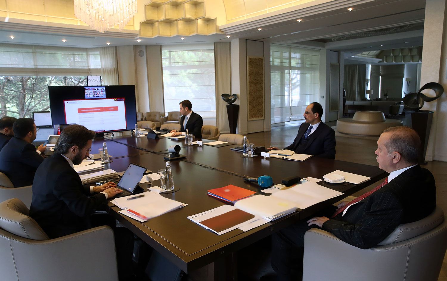 Recep Tayyip Erdoğan, Tarabya’daki Huber Köşkü'nden video konferans yöntemiyle düzenlenen Cumhurbaşkanlığı Kabinesi'nin toplantısının ardından yaptığı açıklamada, kabinenin 26. toplantısını az önce tamamladıklarını, bu toplantıda koronavirüs salgınıyla ilgili özellikle ekonomik gelişmeleri ve güvenlik konularını değerlendirdiklerini söyledi.