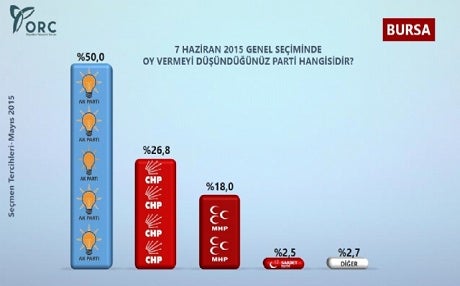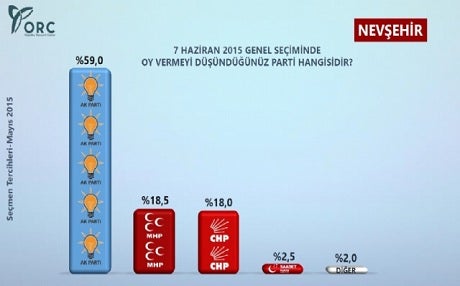 ORC Araştırma son olarak 7 bölgede yer alan İstanbul, Ankara, izmir, Bursa, hatay, Diyarbakır, trabzon, Erzurum, Zonguldak, Afyon, Adıyaman ve Nevşehir'de seçmene, "7 Haziran'da oy vermeyi düşündüğünüz parti hangisidir?" diye sordu.