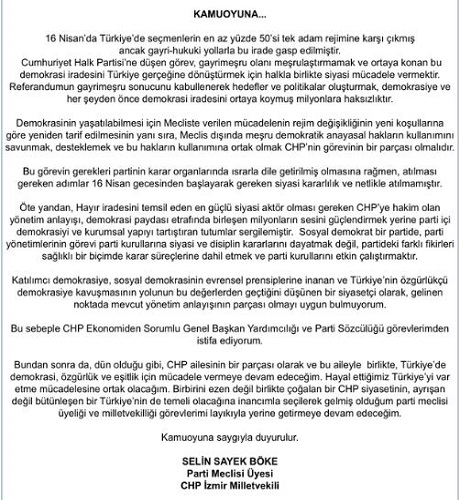 Haber Merkezi - Cumhuriyet Halk Partisi (CHP) Parti Sözcüsü Selin Sayek Böke, partideki görevlerinden istifa ettiğini duyurdu.