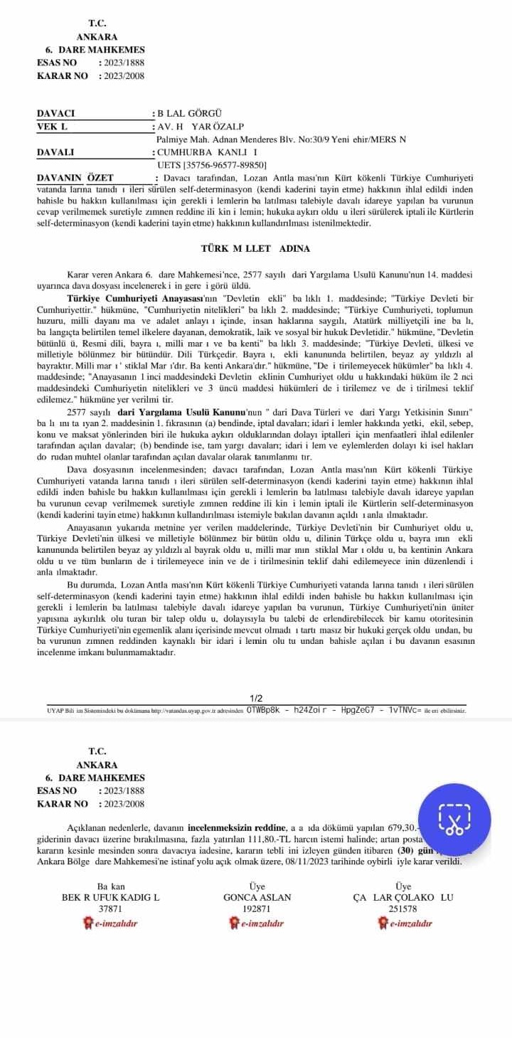 Kürt Diaspora Konfederasyonu (DİAKURD) avukatlarından Hişyar Özalp ve Rıdvan Dalmış, Lozan Antlaşması’nın iptali ve “Kürt halkının self-determinasyon hakkının uygulanması” talebi ile temmuz 2023 yılında Danıştay’a açtığı iptal davası, sonuçlandı. Ankara 6. İdare Mahkemesi Özalp’ın gönderdiği Lozan Antlaşması’nın iptali dilekçesini karara bağladı. Türkiye’de bu davayı inceleyecek herhangi bir otoritenin olmadığını belirten mahkeme, davayı esastan ret etti.
