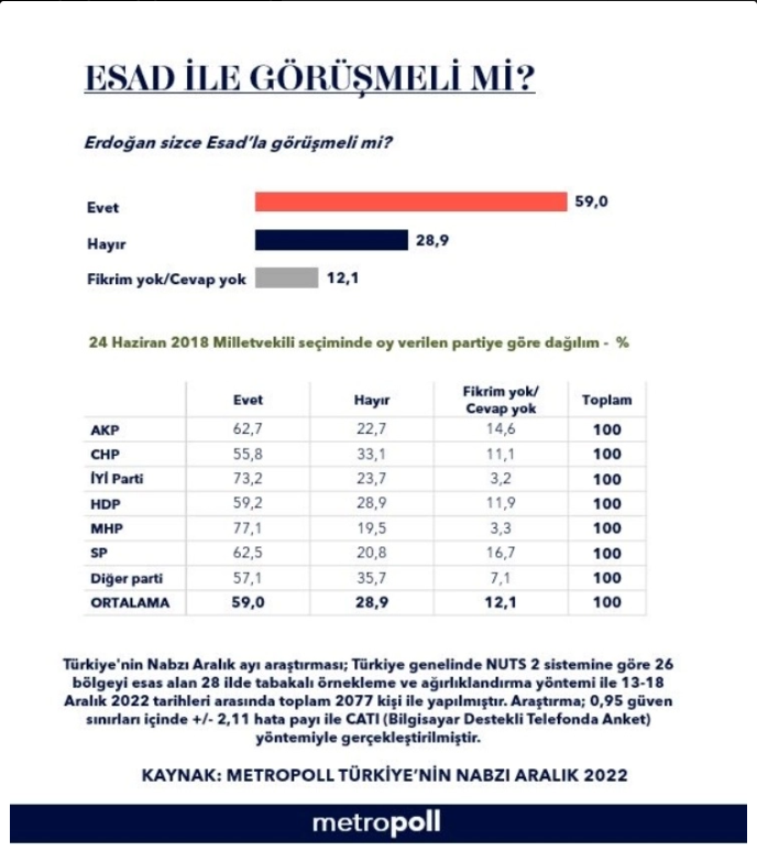 Haber Merkezi - MetroPOLL araştırma şirketinin anketine göre; Türkiye’de Cumhurbaşkanı Erdoğan’ın Suriye Devlet Başkanı Beşar Esad’la görüşmesini isteyenlerin oranı yüzde 59.