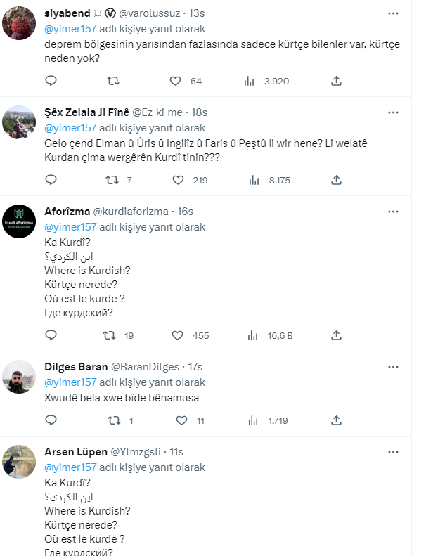 Deprem kurtarma çalışmalarına aktif bir şekilde yer alan Türkiye Göç İdaresi Başkanlığı’na bağlı Yabancılar İletişim Merkezi’nin (YİMER) deprem kurtarma ve yardım hizmetlerinde Türkçe dahil 7 dile yer verip Kürtçe’ye yer vermemesi sosyal medyada tepkiye yol açtı.