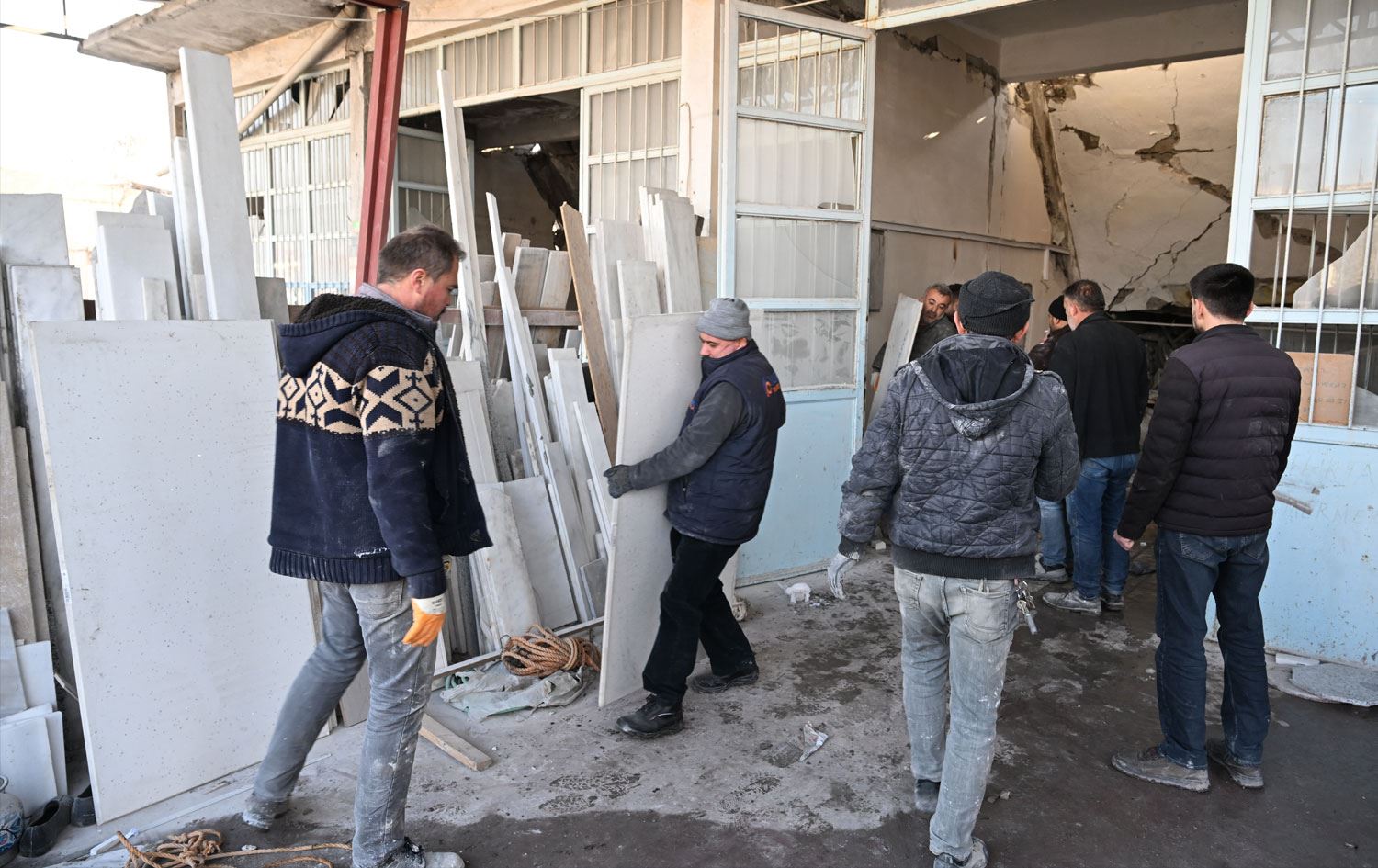Malzemelerini kurtarmaya çalışan iş yeri sahibi Halit Çelik, iş yerindeki iki makineden birinin enkaz altında kaldığını, çıkardıkları malzemeleri de taşıdıklarını belirtti.