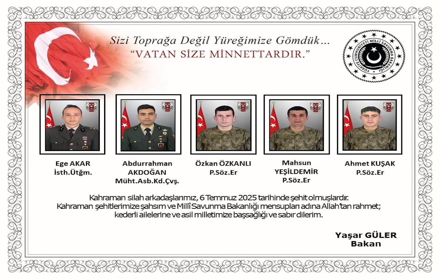 "6 Temmuz 2025 tarihinde, Pençe-Kilit Harekatı bölgesinde 852 Rakımlı Tepe'de bölücü terör örgütü mensupları tarafından kullanılan bir mağarada icra edilen arama tarama faaliyetinde, metan gazından etkilenen üç kahraman silah arkadaşımız daha şehit olmuş, şehit olan personel sayısı sekize yükselmiştir. Bizleri derin bir acı ve üzüntüye boğan bu olayda hayatını kaybeden aziz şehitlerimize Allah'tan rahmet, kederli ailelerine, Türk Silahlı Kuvvetleri ile asil milletimize başsağlığı ve sabır, etkilenenlere de acil şifalar dileriz" ifadelerine yer verildi.