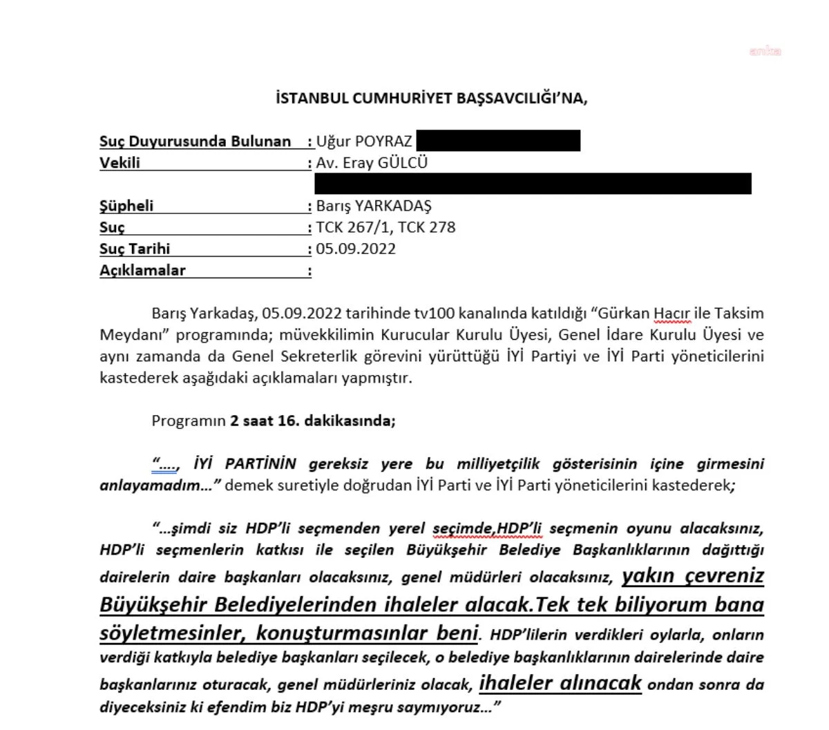 İYİ Parti'den yapılan açıklamaya göre, Poyraz'ın avukatı tarafından İstanbul Cumhuriyet Başsavcılığına verilen suç duyurusu dilekçesinde, 5 Eylül'de tv100 kanalında katıldığı “Gürkan Hacır ile Taksim Meydanı” programında Yarkadaş'ın, şu ifadelerine yer verildi: