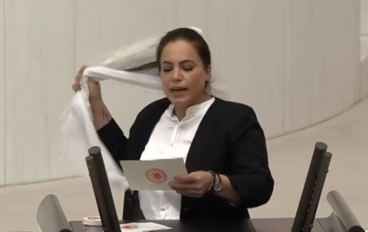 Haber Merkezi - HDP Diyarbakır Milletvekili Remziye Tosun, bütçe görüşmelerinin sürdüğü Meclis Genel Kurulu’nda, barış talebiyle beyaz tülbentini yere attı.