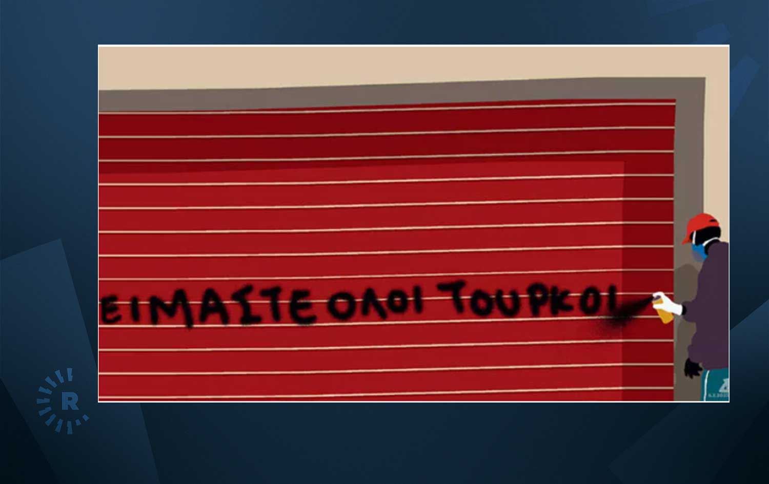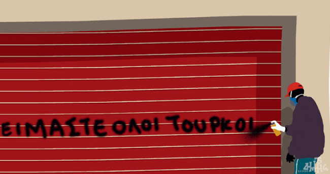 Karikatürde bir grafitcinin duvara Yunanca olarak “Hepimiz Türküz” yazdığı resmedildi.