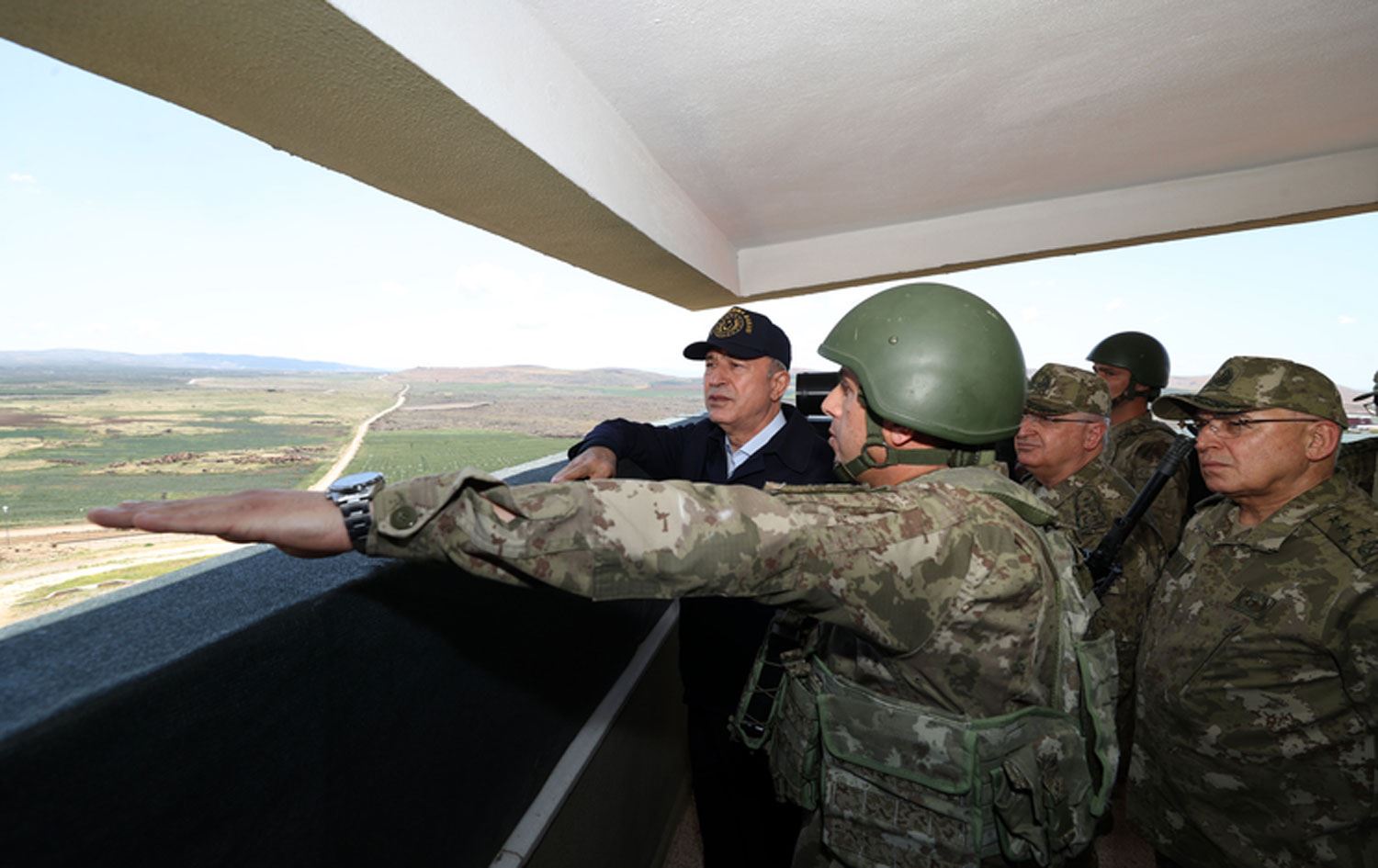 Hudut karakolunda ”tedbirlere ilişkin brifing alan” Akar’ın gözetleme kulesine çıkarak hududu incelediği kaydedildi.