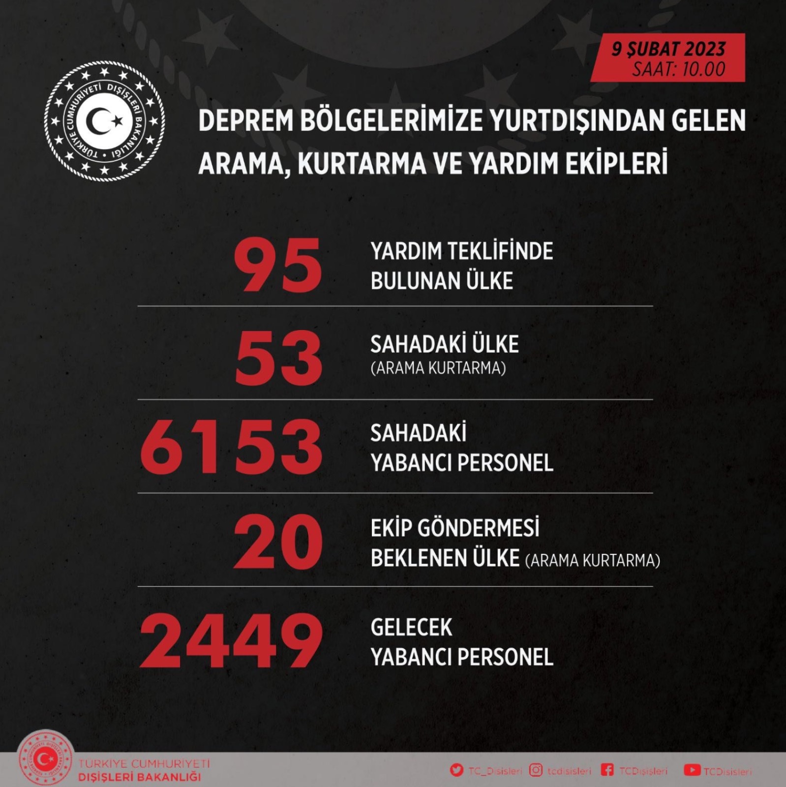 Haber Merkezi – Türkiye Dışişleri Bakanlığı, Maraş merkezli 7,7 ve 7,6 büyüklüğündeki iki depremin ardından 53 ülkenin arama-kurtarma ekipleriyle sahada çalışmalara katıldığını açıkladı. Web sitesinden açıklama yapan bakanlık ayrıca şu ana kadar 95 ülkenin yardım teklifinde bulunduğunu bildirdi.