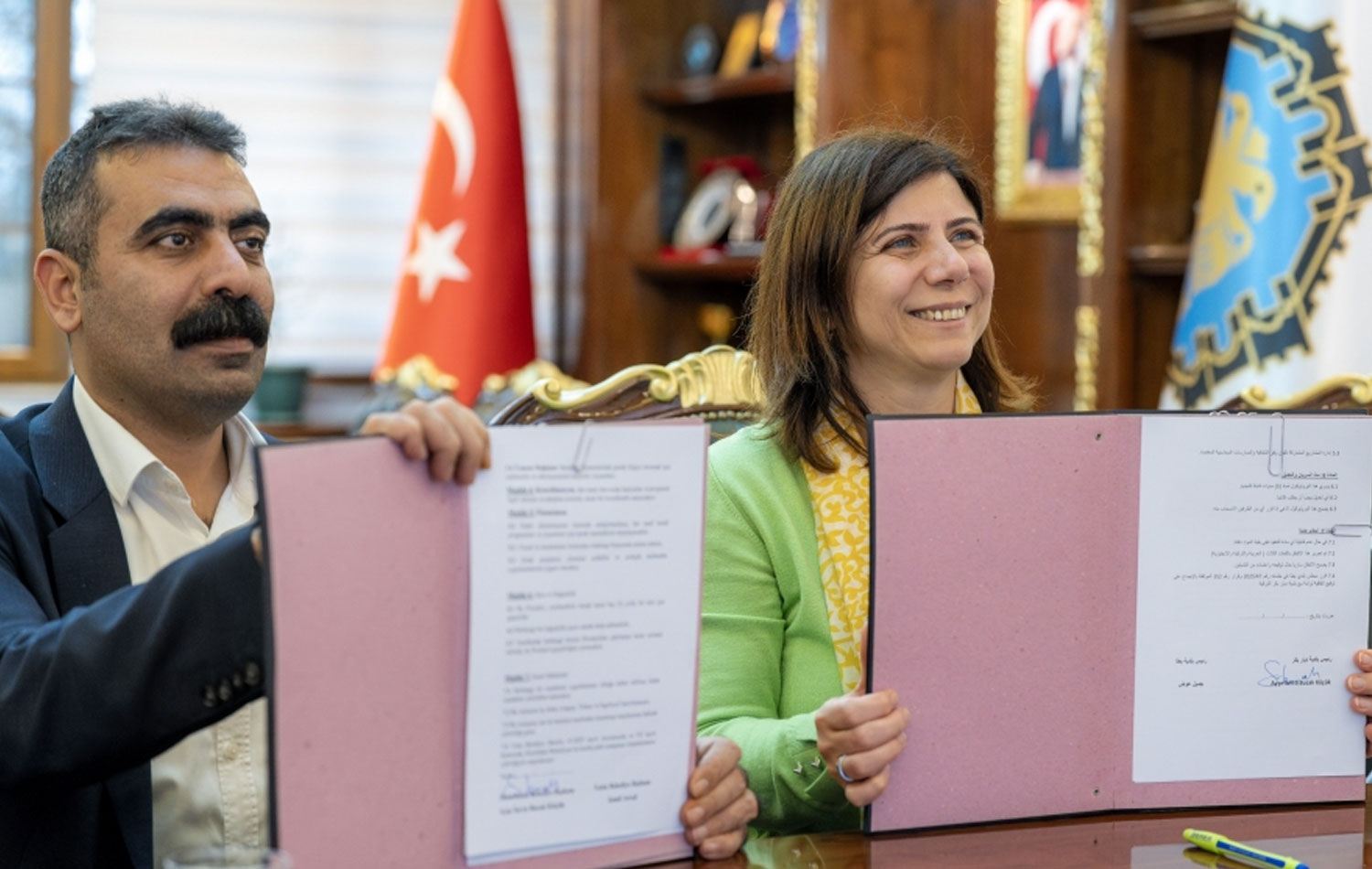 Diyarbakır Büyükşehir Belediyesi Eşbaşkanları Serra Bucak ve Doğan Hatun ise barış mesajları verdi. Ortadoğu coğrafyasına huzurun gelmesinin hem Kürtler hem de Filistinliler için hayati önem taşıdığını belirten Eşbaşkanlar, bu iş birliğinin barış dolu bir gelecek inşa etme yolunda sembolik ve pratik bir öneme sahip olduğunu kaydetti.