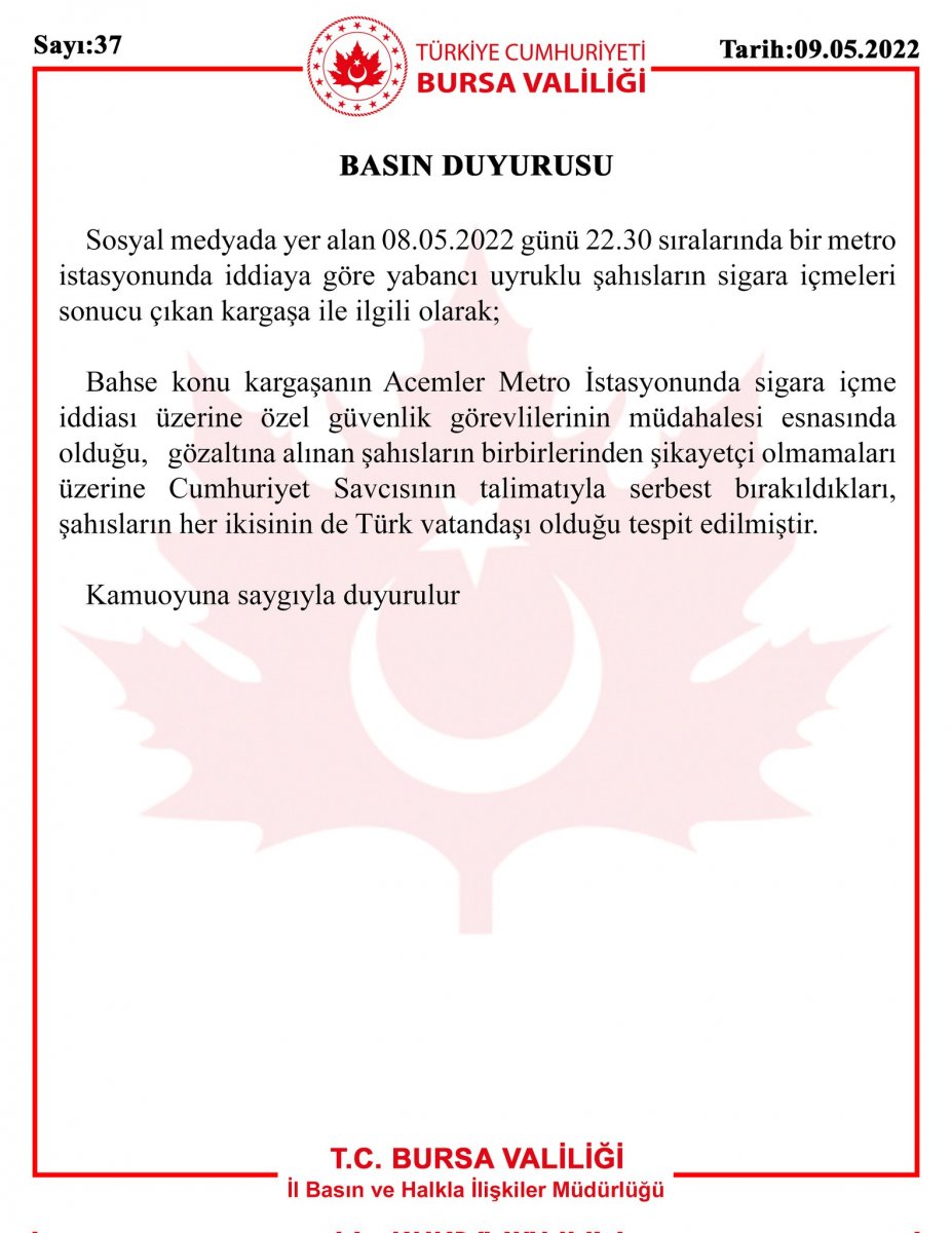 Bursa Valiliği'nden yapılan basın duyurusunda; Yabancı uyruklu oldukları iddia edilen şahısların Türkiye vatandaşı olduğu belirtildi.