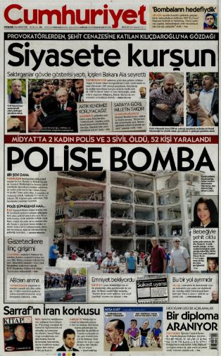 İstanbul Vezneciler’de bombalı araçla gerçekleştirilen saldırının kurbanları toprağa verilmeden bir acı haber de Mardin’in tarihi ve turistik ilçesi Midyat’tan geldi. Bomba yüklü minibüsle İlçe Emniyet Müdürlüğü’ne girmek isteyen terörist, kendisini fark eden polislerin ateş açması üzerine demir korkuluk ve beton bariyerlerin önünde aracı infilak ettirdi. Saldırıda iki kadın polis şehit oldu, üç sivil öldü. Aralarında polis ve sivillerin bulunduğu 51 kişi de yaralandı. PKK’lı teröristin parçalandığı saldırıda emniyet binası ile çevredeki araç ve binalar da hasar gördü.