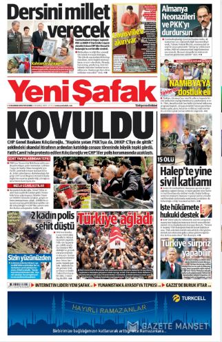 Hendek kazan teröristlerden 'arkadaş' diye bahsederken, yumurtalı protestoya katılan şehit yakınlarını 'terörist' ilan etmekten çekinmeyen, üzerine bir de 'hapisteki PKK'lıya da DHKP-C'liye de ayrım yapmadan gittiğini' gururla anlatan CHP Genel Başkanı Kemal Kılıçdaroğlu, yine bir şehit cenazesinde linç edilmekten kılpayı kurtuldu. Terör örgütü PKK'nın Vezneciler saldırısında şehit ettiği polis memurlarından Gökhan Topçu ile Kadir Cihan Karagözlü için Fatih Camii'nde düzenlenen törene, başta Kılıçdaroğlu olmak üzere CHP'lilere yönelik protestolar damgasını vurdu.