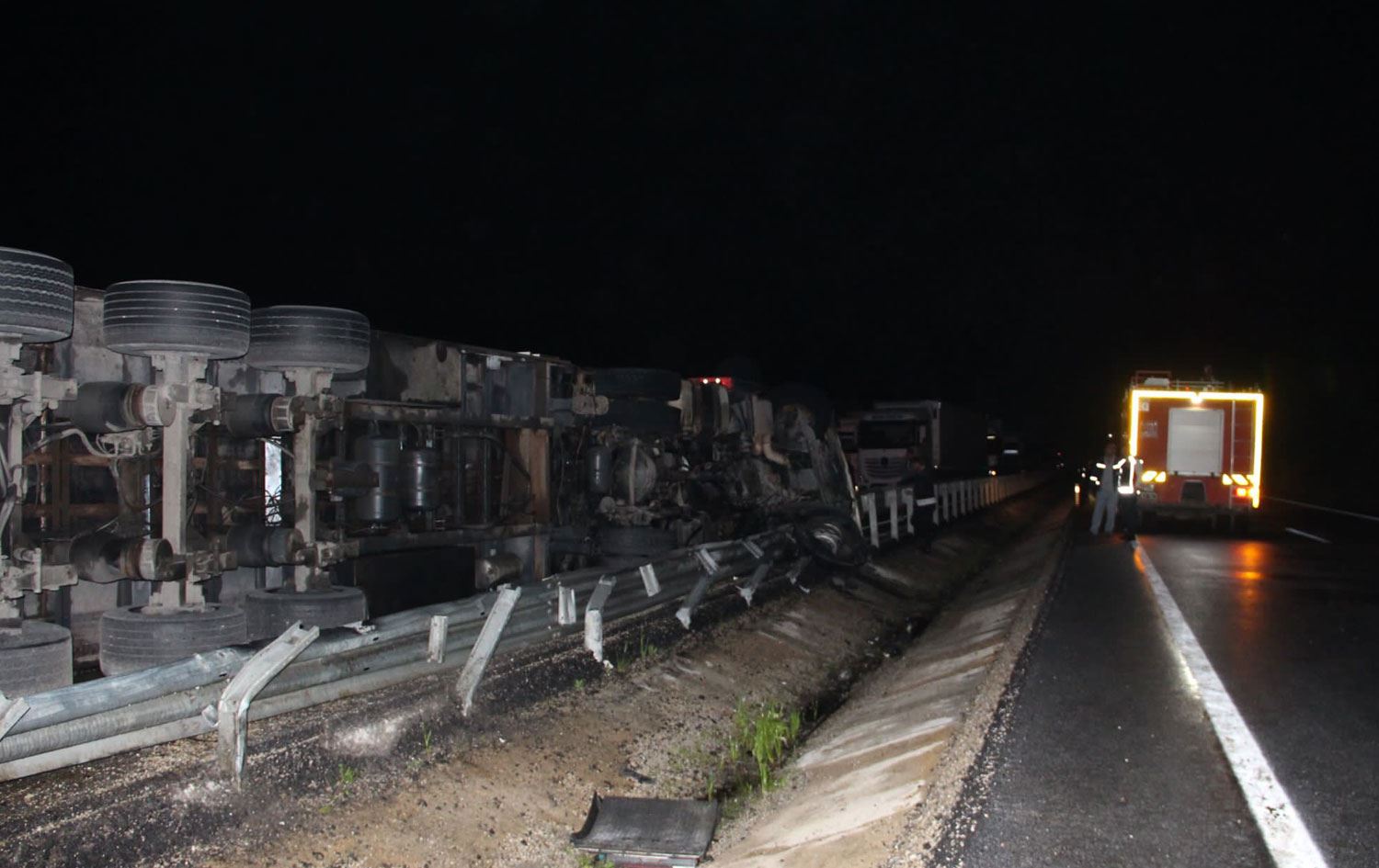 Alınan bilgiye göre, sürücüsünün ismi ve plakası henüz öğrenilemeyen büyükbaş hayvan yüklü tır, Afyonkarahisar - Uşak kara yolu Çalışlar köyü yakınlarında devrilerek yanmaya başladı.