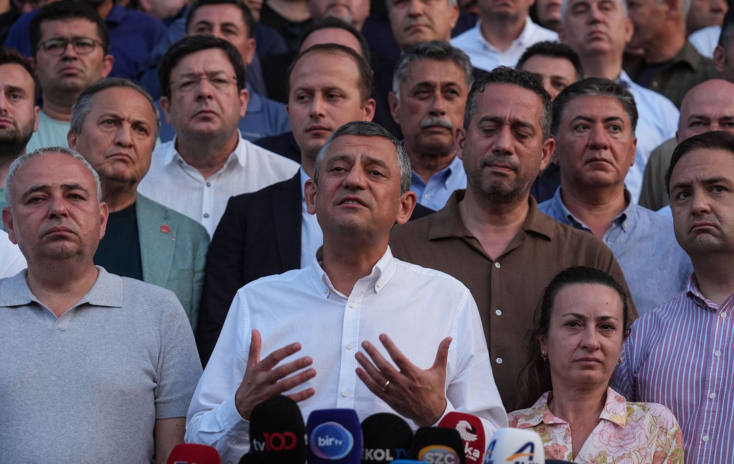CHP Genel Başkanı Özgür Özel (ortada), evinde elektrik akımına kapılan ve kaldırıldığı hastanede hayatını kaybeden Manisa Büyükşehir Belediye Başkanı Ferdi Zeyrek'in vefatına ilişkin Manisa Celal Bayar Üniversitesi Hafsa Sultan Hastanesi önünde açıklama yaptı. / AA