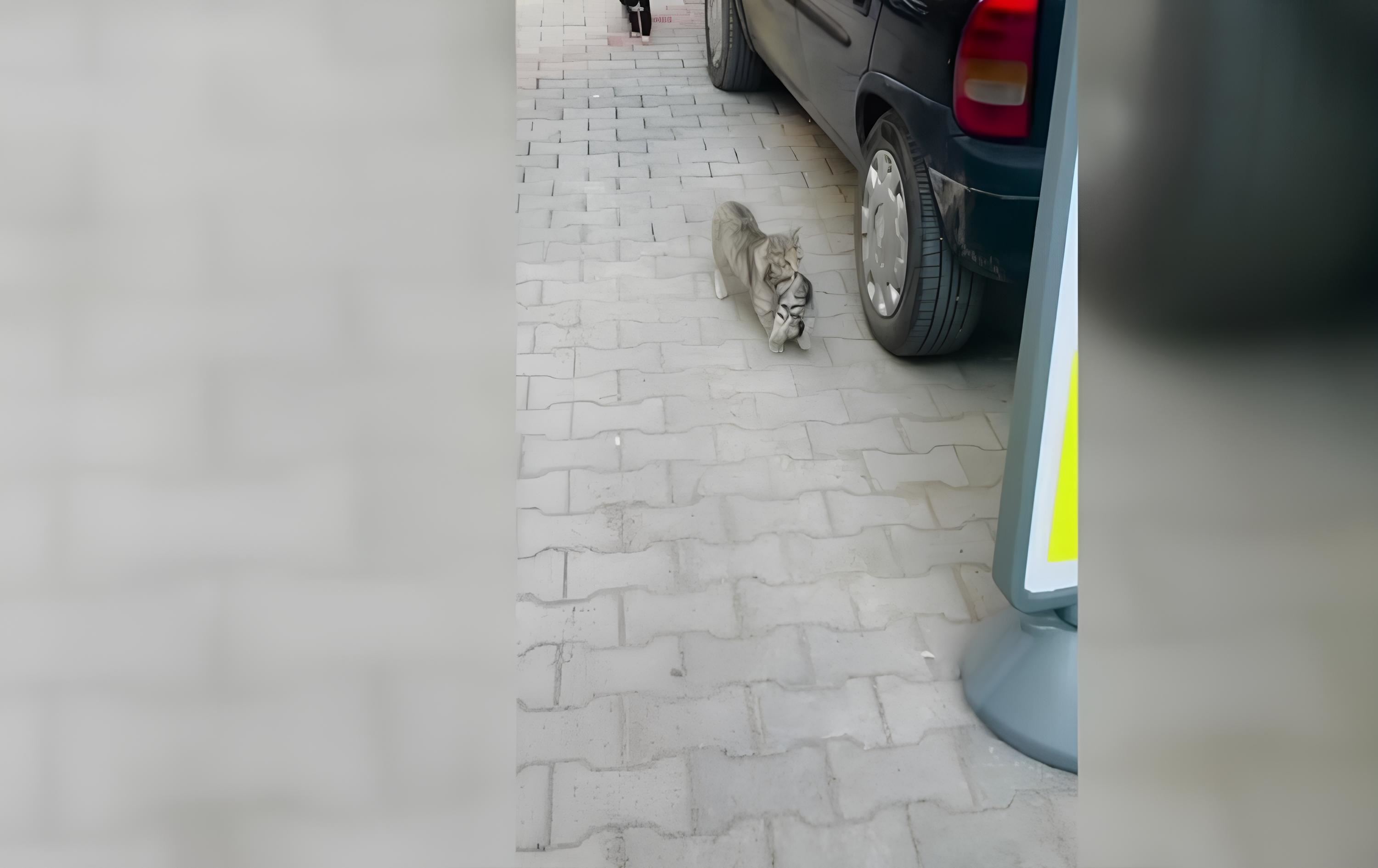 Şekerpınar Mahallesi 4003. Sokak'ta Veteriner Hekim Celal Han Şahin ve Utku Berk Kızmaz, ağzında yavrusunu taşıyan kedinin sokakta kendilerine doğru yaklaştığını fark edince cep telefonuyla görüntü aldı.