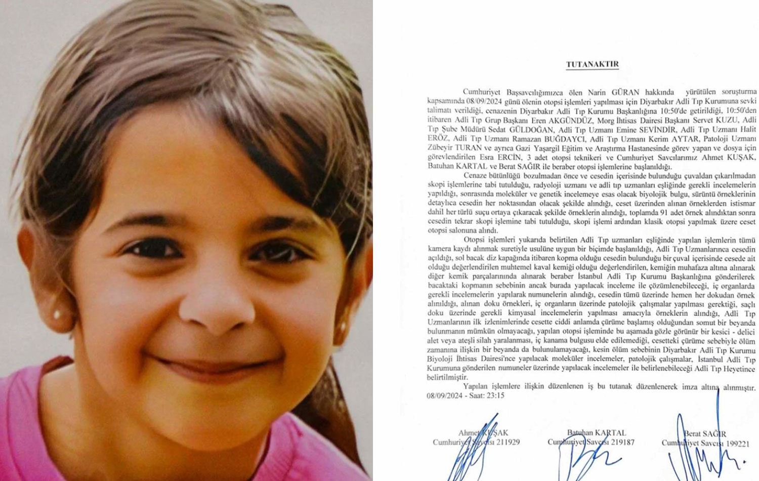 Haber Merkezi - Diyarbakır'ın Bağlar ilçesindeki Tavşantepe köyünde 21 Ağustos'ta kaybolduktan 19 gün sonra dün cansız bedeni bulunan 8 yaşındaki Narin Güran'ın ön otopsi raporu tutanağı paylaşıldı.