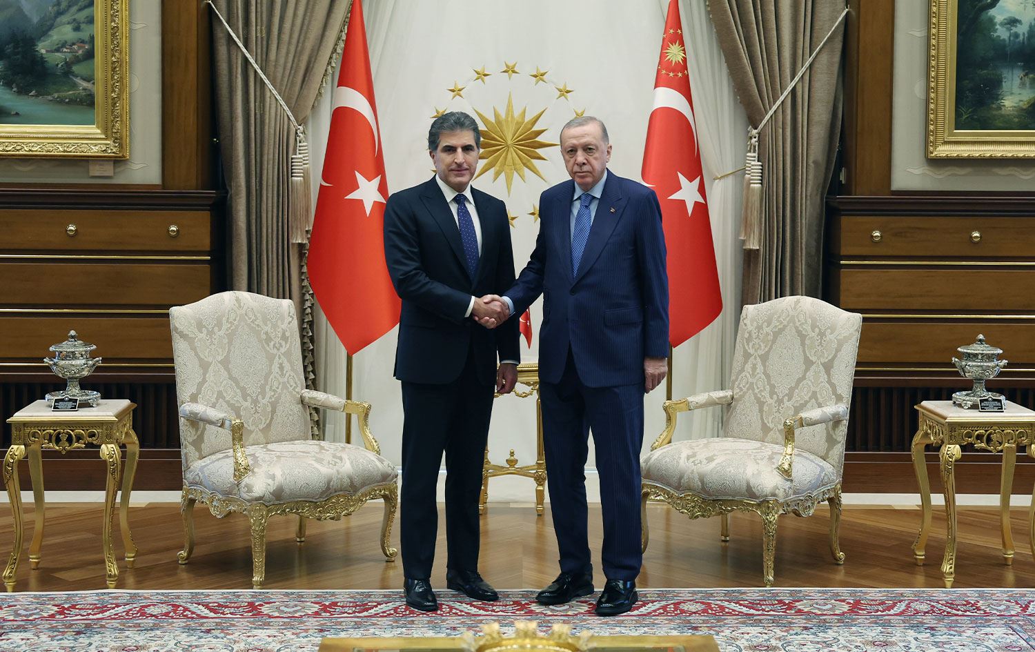Kürdistan Bölgesi Başkanı Neçirvan Barzani, Türkiye'ye gerçekleştirdiği resmi ziyaret kapsamında Ankara'da Türkiye Cumhurbaşkanı Recep Tayyip Erdoğan ile bir araya geldi.