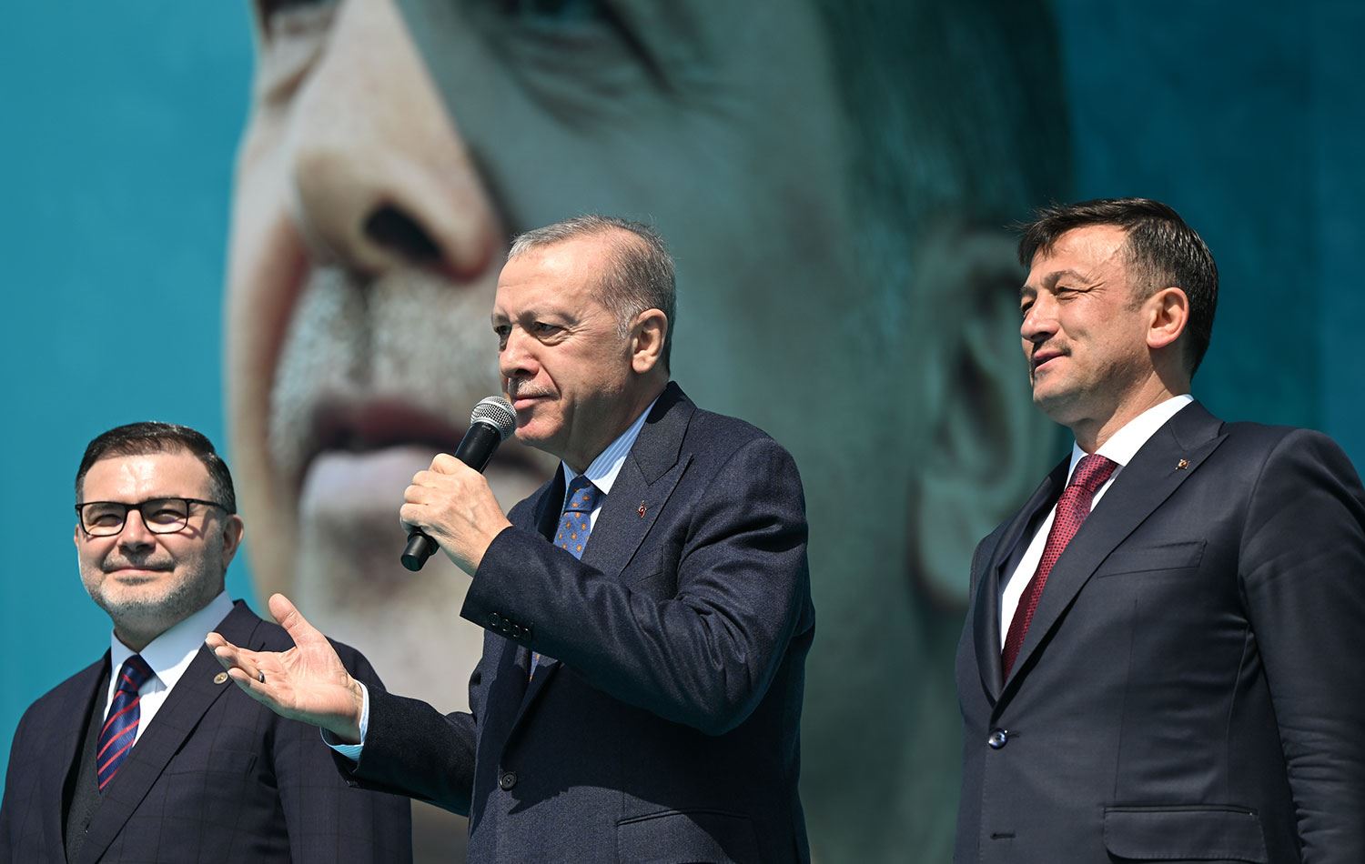 Cumhurbaşkanı Erdoğan, partisi tarafından İzmir Gündoğdu Meydanı’nda düzenlenen mitinge katıldı. Cumhur İttifakının AK Parti İzmir Büyükşehir Belediye Başkan adayı Hamza Dağ (sağda), AK Parti İzmir İl Başkanı Bilal Saygılı (solda) da katıldı. / AA