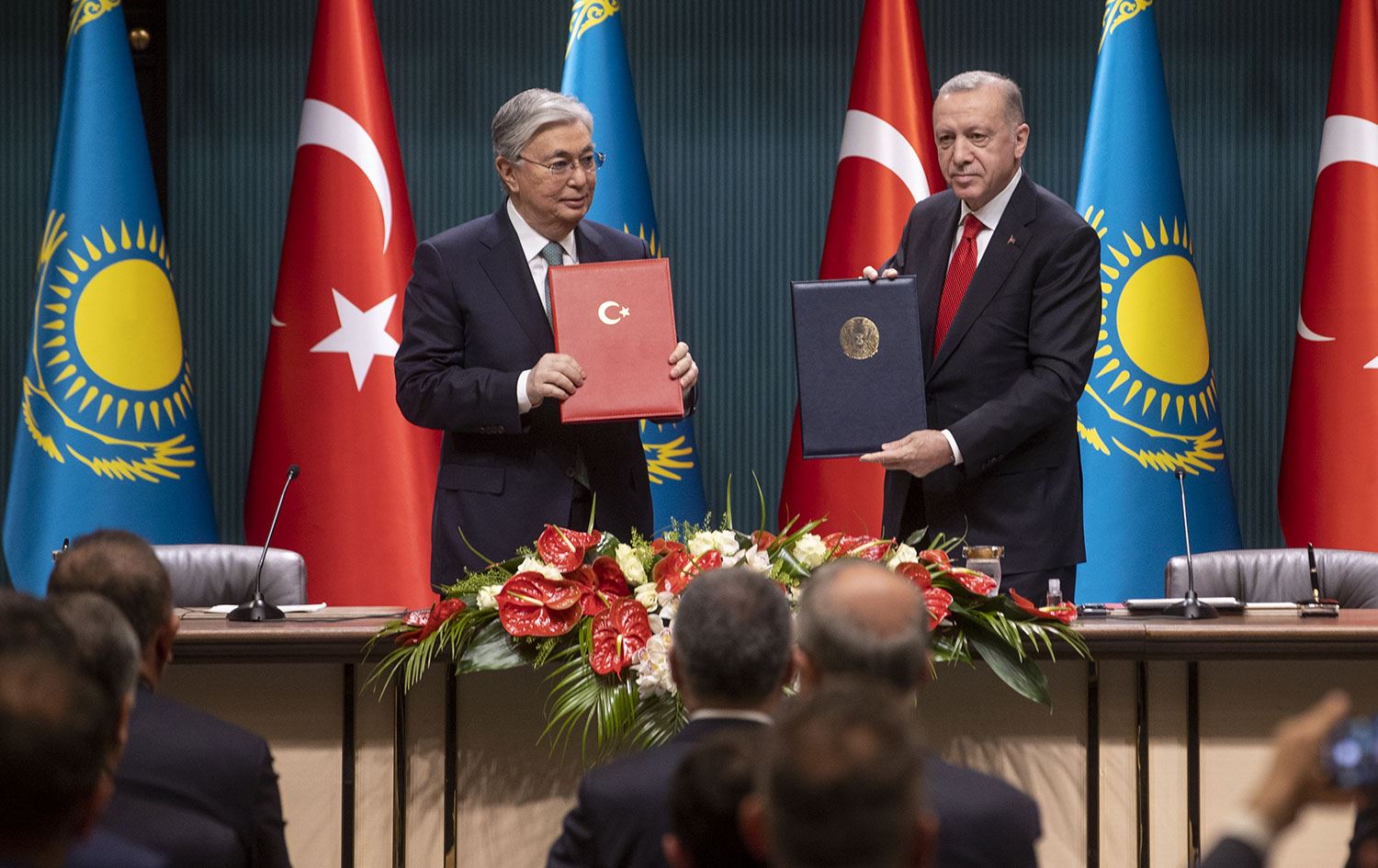 Tokayev'in Türkiye'ye Cumhurbaşkanı olarak ilk resmi ziyaretini gerçekleştirdiğini ve Tokayev ile heyetini misafir etmekten büyük memnuniyet duyduğunu belirten Cumhurbaşkanı Erdoğan da "Kazakistan, nasıl bizim ata yurdumuzsa, Türkiye de Kazak kardeşlerimizin ikinci evidir" diye konuştu.