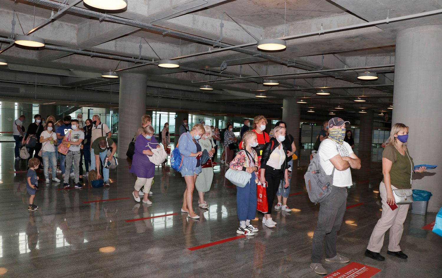 Termal kameralardan geçen ve belirli noktalara yerleştirilen dezenfektanlarla ellerini dezenfekte eden turistler, pasaport ve valiz işlemlerinin ardından servislerle konaklayacakları otellere hareket etti.