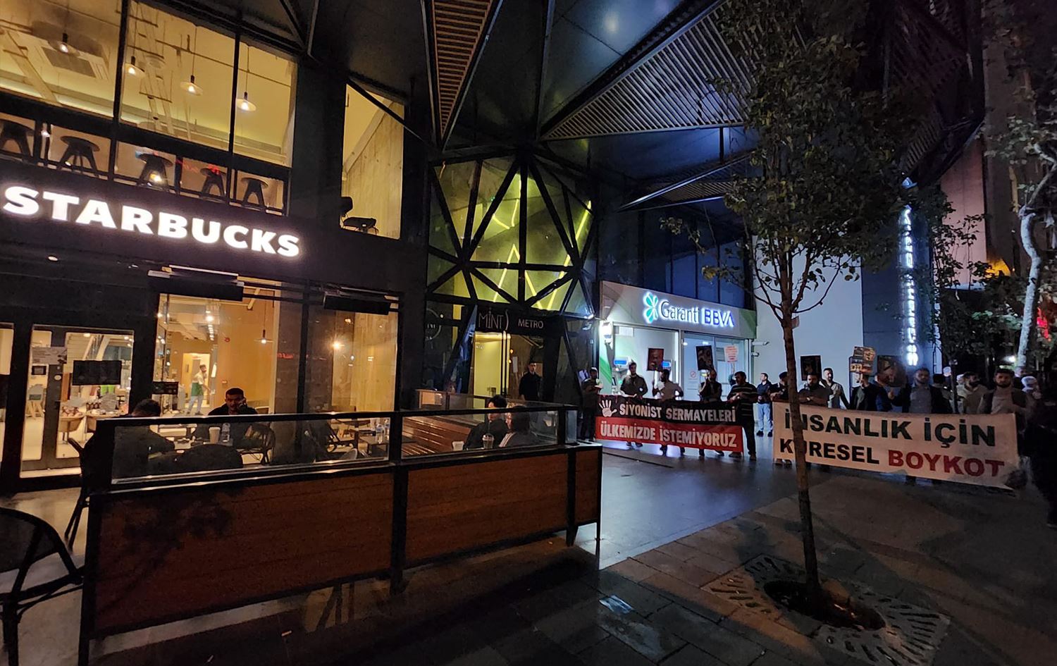 Protestocular, kahve zinciri Starbucks'ın Avcılar, Kağıthane, Sultanbeyli ve Zeytinburnu'ndaki şubelerinin önünde bir araya geldi, polis çevrede güvenlik önlemi aldı.