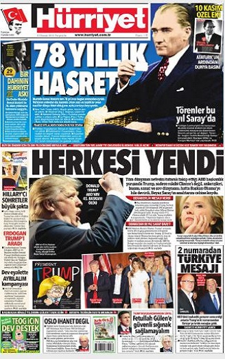 Yanlı anketlerin, dev şirketlerin, medyanın ve Hollywood'un baskısına rağmen ABD seçim sandığından Donald Trump çıktı. 228'e karşı 279 delegeye ulaşan Cumhuriyetçi Trump, Demokrat rakibi Clinton'ı açık ara mağlup etti. Balkon konuşmasında Trump, "Tüm uluslarla iyi geçineceğiz" dedi.