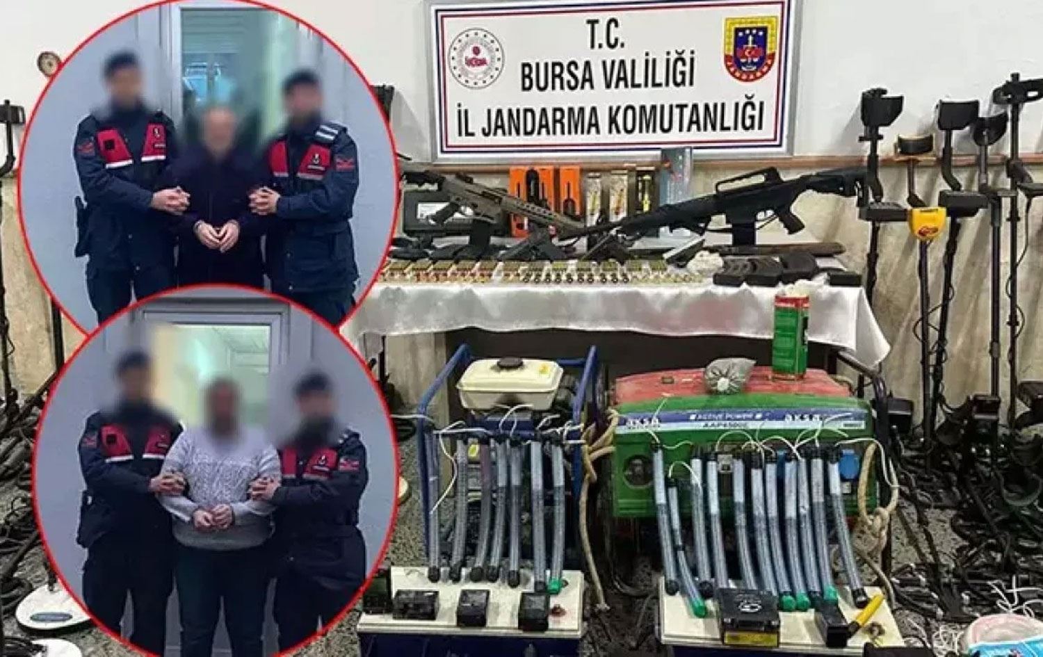 DHA'nın aktardığına göre baba, oğlu ve torunu gözaltına alınırken, adreslerinde yapılan aramalarda, tarihi eser niteliğinde olduğu değerlendirilen 46 sikke, 64 adet define arama dedektörü, 8 adet define arama pointer dedektörü, 4 adet define aramak için kullanılan civa uçlu bakır çubuklu düzenek, 18 adet plastik boru içinde gübre ve barutla hazırlanmış dinamit lokumu, dinamit lokumlarını elektrik akımı ile patlatmada kullanılan akü ile beslenen antenli düzenek, 300 metre patlatma için kullanılan elektrik kablosu, 500 gram barut, 150 gram Amonyum Nitrat, 2 jeneratör, 2 güç kaynağı, 1 hilti ile 3 ruhsatsız tabanca, 3 ruhsatsız av tüfeği, 650 adet tabanca fişeği, 100 adet av tüfeği fişeği ele geçirildi.