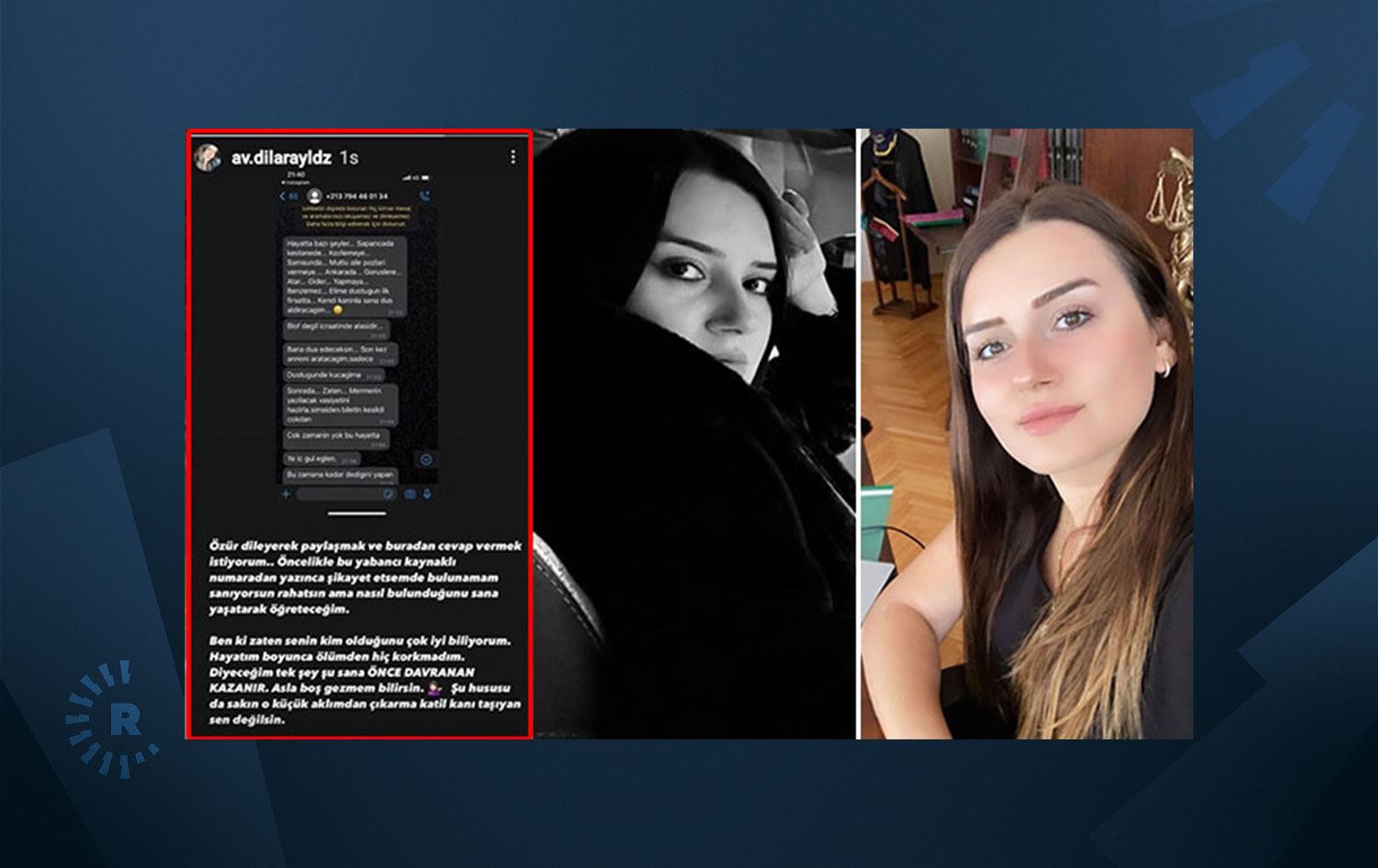 Dönmez'in mesajlarında Yıldız'a ' Hayatta bazı seyler, Sapanca'da kestane közlemeye, Samsun'da mutlu aile pozları vermeye, Ankara'da görüşlere, atar gider yapmaya benzemez. Elime düştüğün ilk fırsatta kendi kanınla sana duş aldıracağım. Blöf degil icraatinde alasıdır. Bana dua edeceksin. Son kez anneni aratacağım. Sadece düştüğünde kucağıma. Sonrada zaten mermerin yazılacak vasiyetini hazırla. Şimdiden biletin kesildi çoktan. Çok zamanın yok bu hayatta. Ye iç gül eğlen.' dediği öğrenildi. Kendisine atılan mesajları sosyal medya hesabında paylaşan Yıldız'ın ise, "Özür dileyerek paylaşmak ve buradan cevap vermek istiyorum.. Öncelikle bu yabancı kaynaklı numaradan yazınca şikayet etsem de bulunamam sanıyorsun, rahatsın ama nasıl bulunduğunu sana yaşatarak öğreteceğim" dediği görüldü.
