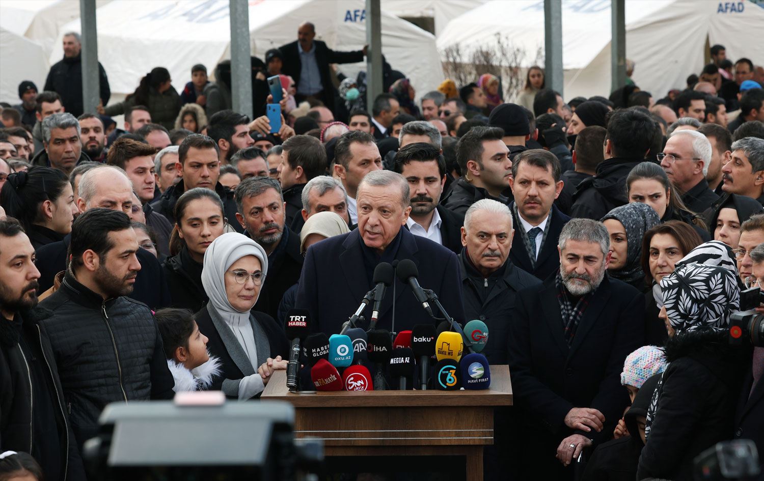 Erdoğan, “Afet çalışmalarıyla görevli kurumlarımızın yanı sıra bakanlıklarımızın tüm birimlerini, polisi, askeri, jandarmasıyla güvenlik güçlerimizin tamamını hemen bölgeye yönlendirdik. Bakanlarımız, valilerimiz, belediye başkanlarımız, resmi kurumlarımız ve sivil toplum kuruluşlarımız ilk günden itibaren canla başla çalışıyor. Bu süreçte afetin büyüklüğünün ve çetin kış şartlarının getirdiği zorluklar sebebiyle insan iradesini aşan pek çok sıkıntıyla karşılaştık. Ancak hiçbir engelin, bizi vatandaşımızın yardımına koşmaktan alıkoymasına izin vermedik. Elbette kimi alanlarda bazı gecikmeler, aksaklıklar yaşanmıştır ama devletimizin depremzede vatandaşlarımızın yanında olmak için verdiği samimi mücadeleyi kimse inkar edemez” ifadelerini kullandı.