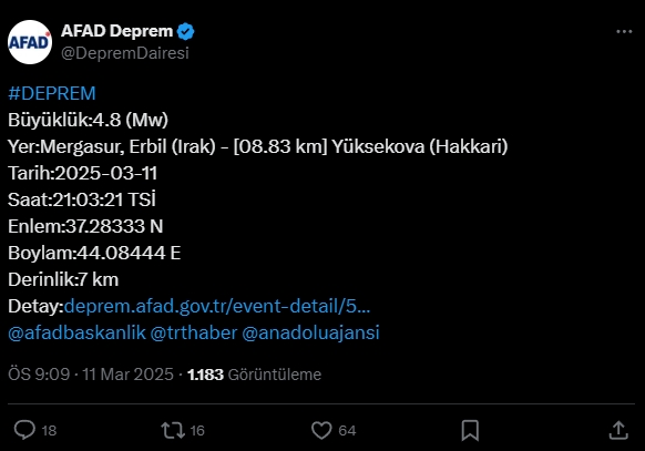 Haber Merkezi – Afet ve Acil Durum Yönetimi Başkanlığının (AFAD) internet sitesinde yer alan bilgiye göre, Hakkari Yüksekova ile Kürdistan Bölgesi'nin başkenti Erbil'e bağlı Mergesor arasında 4.8 şiddetinde deprem meydana geldi. Kandilli Rasathanesi ise depremin merkez üssünü Yüksekova olarak geçti.