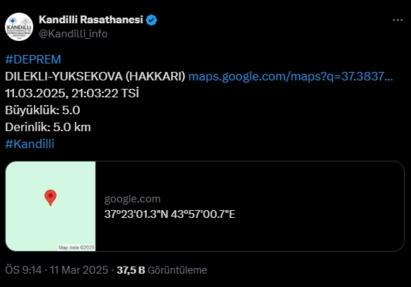 Kandilli Rasathanesi: Deprem merkez üssü Yüksekova