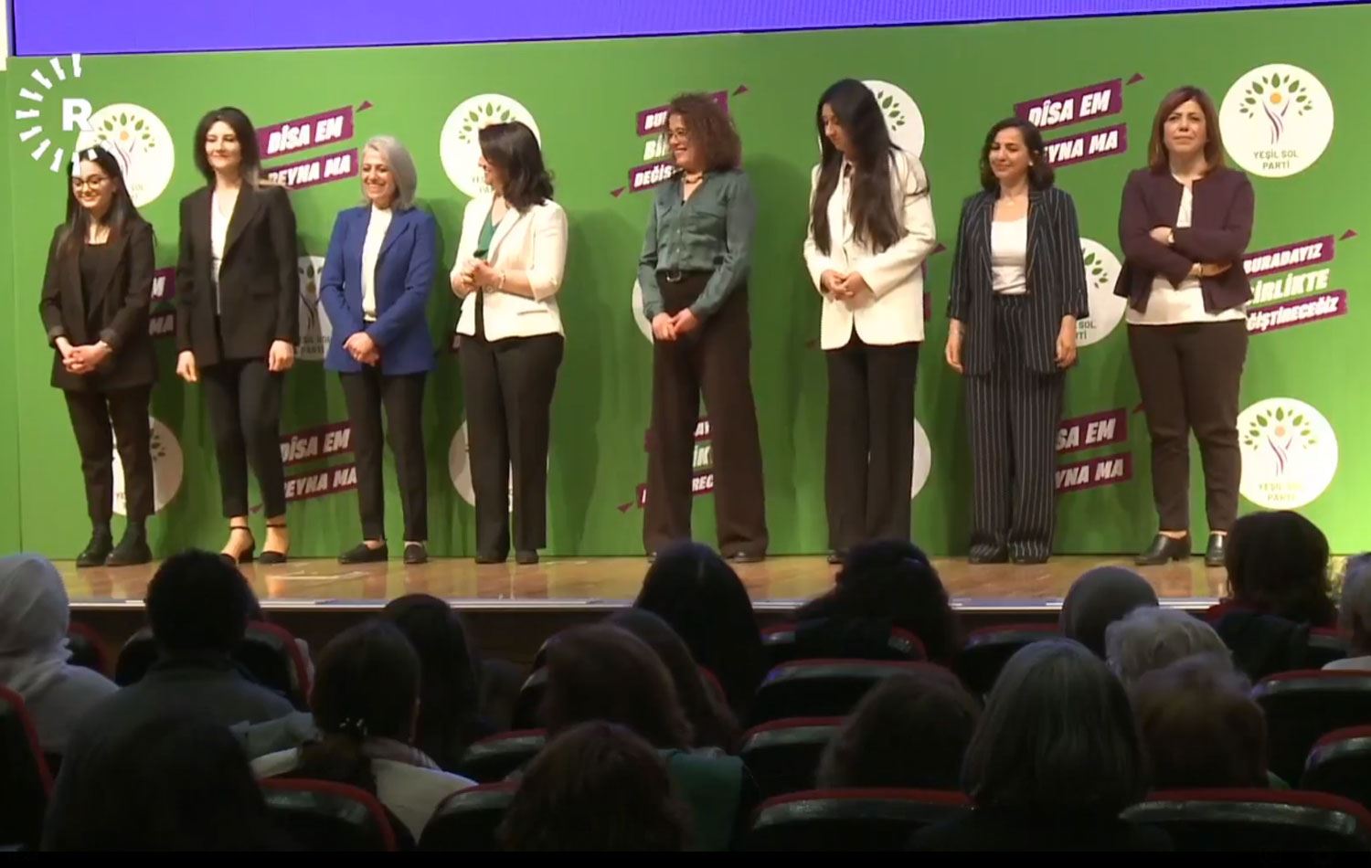 Kadın milletvekilleri, Yeşil Sol Parti Eş Sözcüsü Çiğdem Kılıçgün Uçar ve HDP Eş Genel Başkanı Pervin Buldan ile birlikte salondaki katılımcıları selamladı. Ardından kadın adaylar sahneye davet edildi.