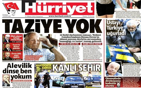 Hürriyet gazetesi ise, Cumhurbaşkanı Recep Tayyip Erdoğan’ın Almanya’da katıldığı Gençlik Buluşması’nda gerçekleştirdiği konuşmasını, “Alevilik bir dinse ben yokum” başlığıyla duyurdu. Haberde şöyle denildi: