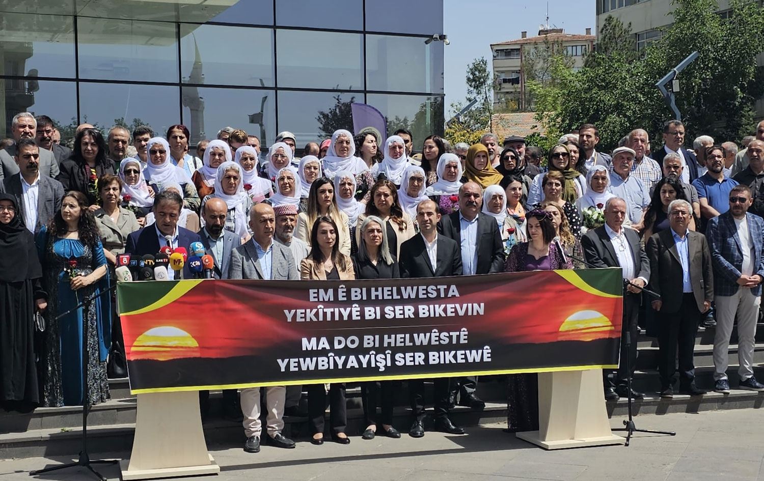 “Em ê bi helwesta yekîtiyê bi ser bikevin” pankartının taşındığı açıklamaya, Demokratik Bölgeler Partisi (DBP) Eş Genel Başkanları Çiğdem Kılıçgün Uçar ve Keskin Bayındır, Halkların Eşitlik ve Demokrasi Partisi (DEM Parti) Eş Genel Başkanı Tülay Hatimoğullları, Demokratik Toplum Kongresi (DTK) Eşbaşkanı Berdan Öztürk ile belediye eşbaşkanları ve milletvekillerinin yanı sıra çok sayıda kişi katıldı.