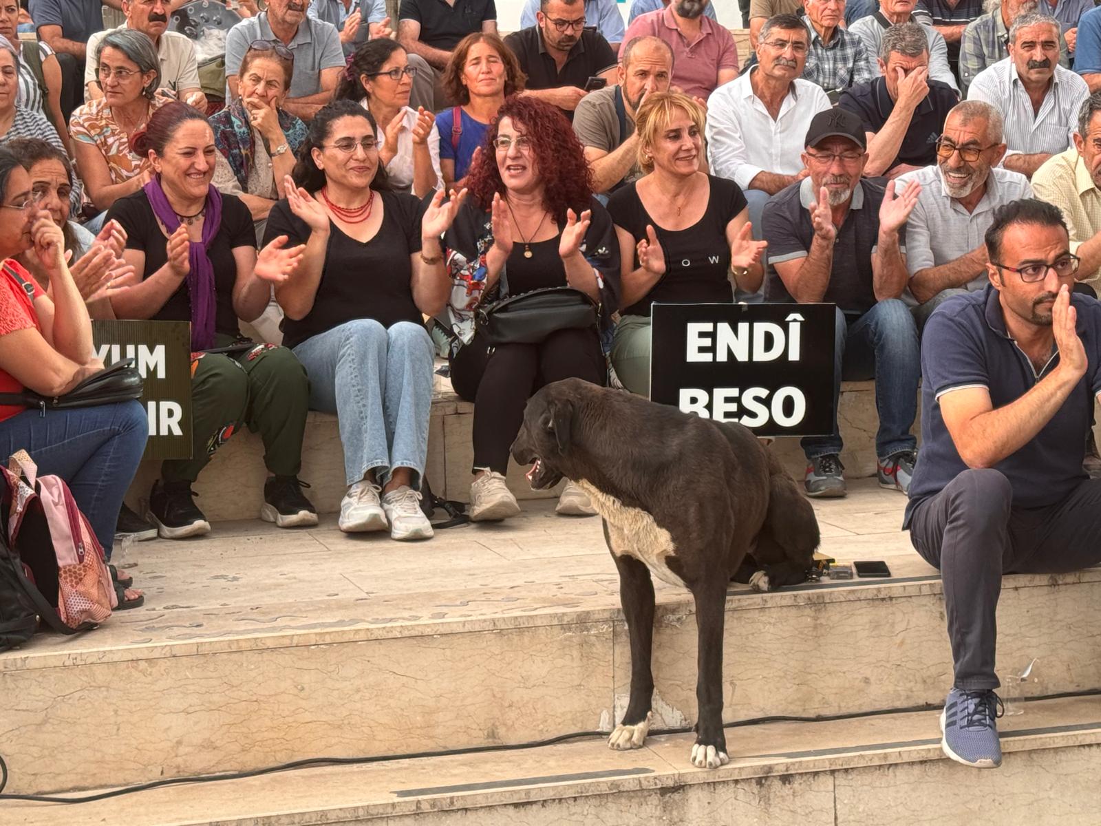 Hakkari Belediyesi’ne kayyım atanmasına tepki gösteren vatandaşlar da bir araya gelerek müzik eşliğinde kayyım atamasını protesto ediyor.