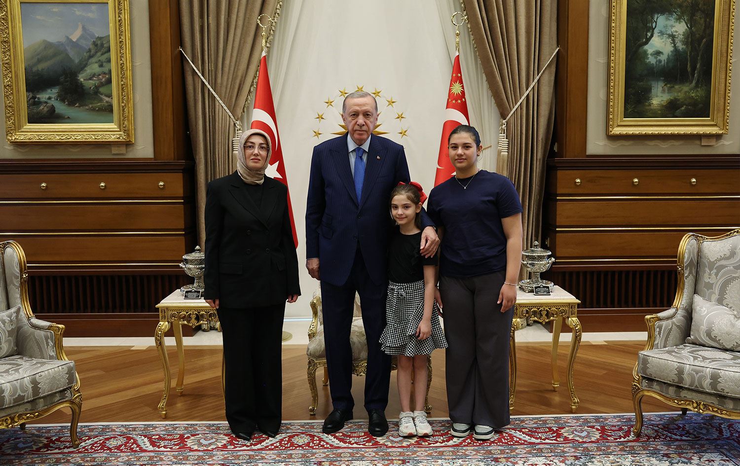 Erdoğan, Ankara'da öldürülen eski Ülkü Ocakları Genel Başkanı Sinan Ateş'in eşi Ayşe Ateş'i Beştepe'deki Cumhurbaşkanlığı Külliyesi'nde kabul etti.