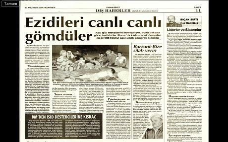 Hürriyet gazetesi, “Kadın ve çocukları diri diri gömdüler” başlıklı haberinde Irak İnsan Hakları Bakanı El Sudani’nin IŞİD’in en az 500 Êzidî’yi öldürdüğü, bazı insanları diri diri gömdüğü yönüdeki sözlerini sayfasına taşıdı.