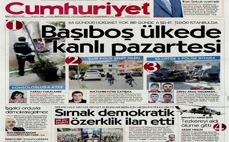 Haber Merkezi – Türkiye'de dün ABD'nin İstanbul Başkonsolosluğu ile Sultanbeyli'deki polis karakoluna yapılan saldırı ve Şırnak'ta yaşanan olaylar, bu sabah tüm gazetelerin manşetlerinde ya da sürmanşetlerinde yer aldı.